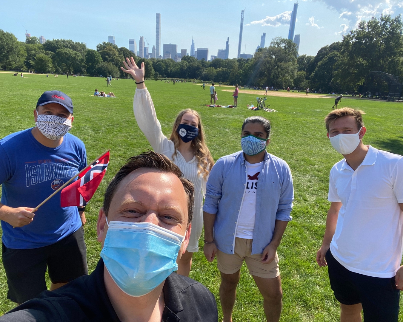 Thomas (til høyre) sammen med Sjømannsprest Odd Inge Tangen og andre studenter på piknik i Central park.