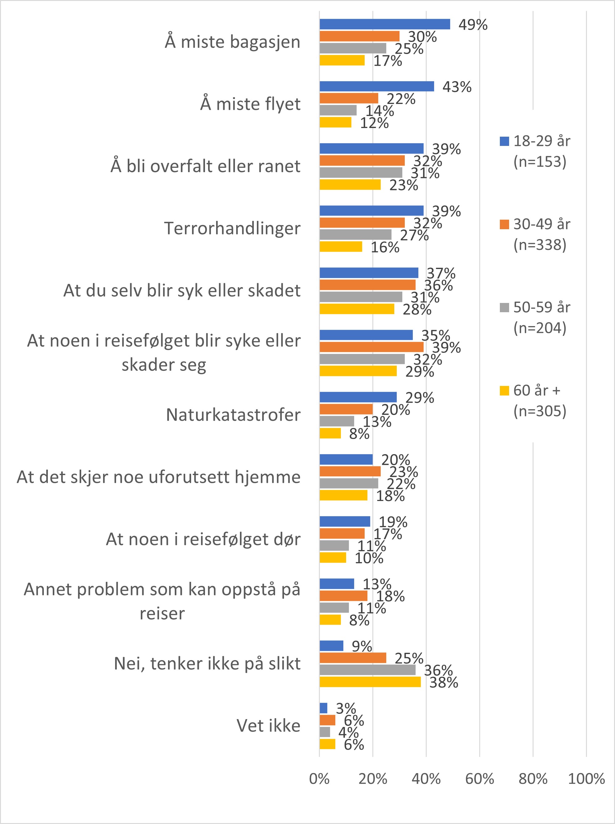 Spørsmål: Når du er på reise, er du da engstelig for at noe av det følgende kan skje med deg og reisefølget ditt?