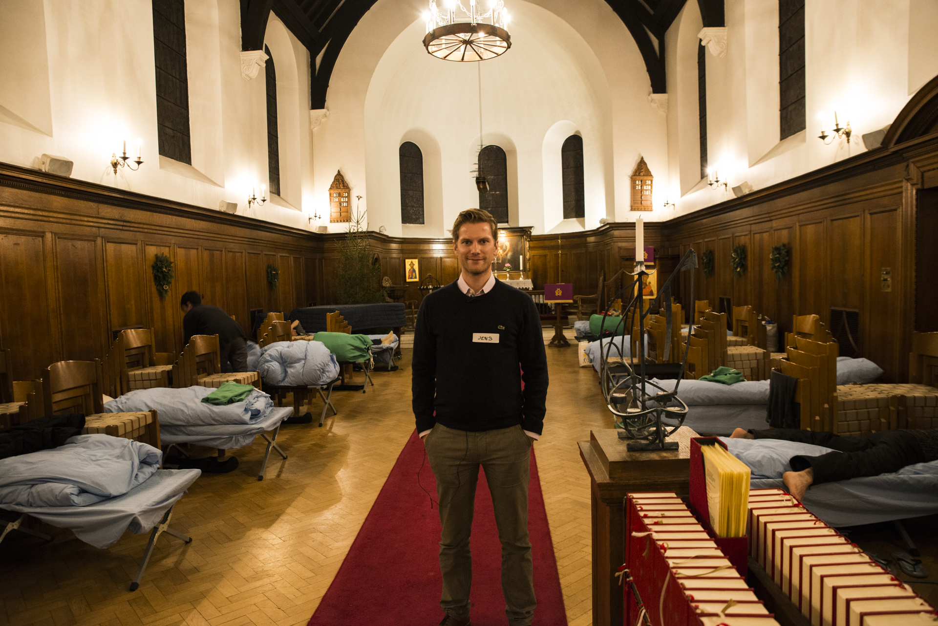 Når klokken nærmer seg 18 begynner de første hjemløse å komme. De «sjekkes inn» og får utlevert navnelapper og poser med sengetøy og håndkle. Sengene for mennene er spredt utover kirkerommet med altertavlen bakerst, mens kvinnene, som er betydelig færre, har fått plass på lekerommet.