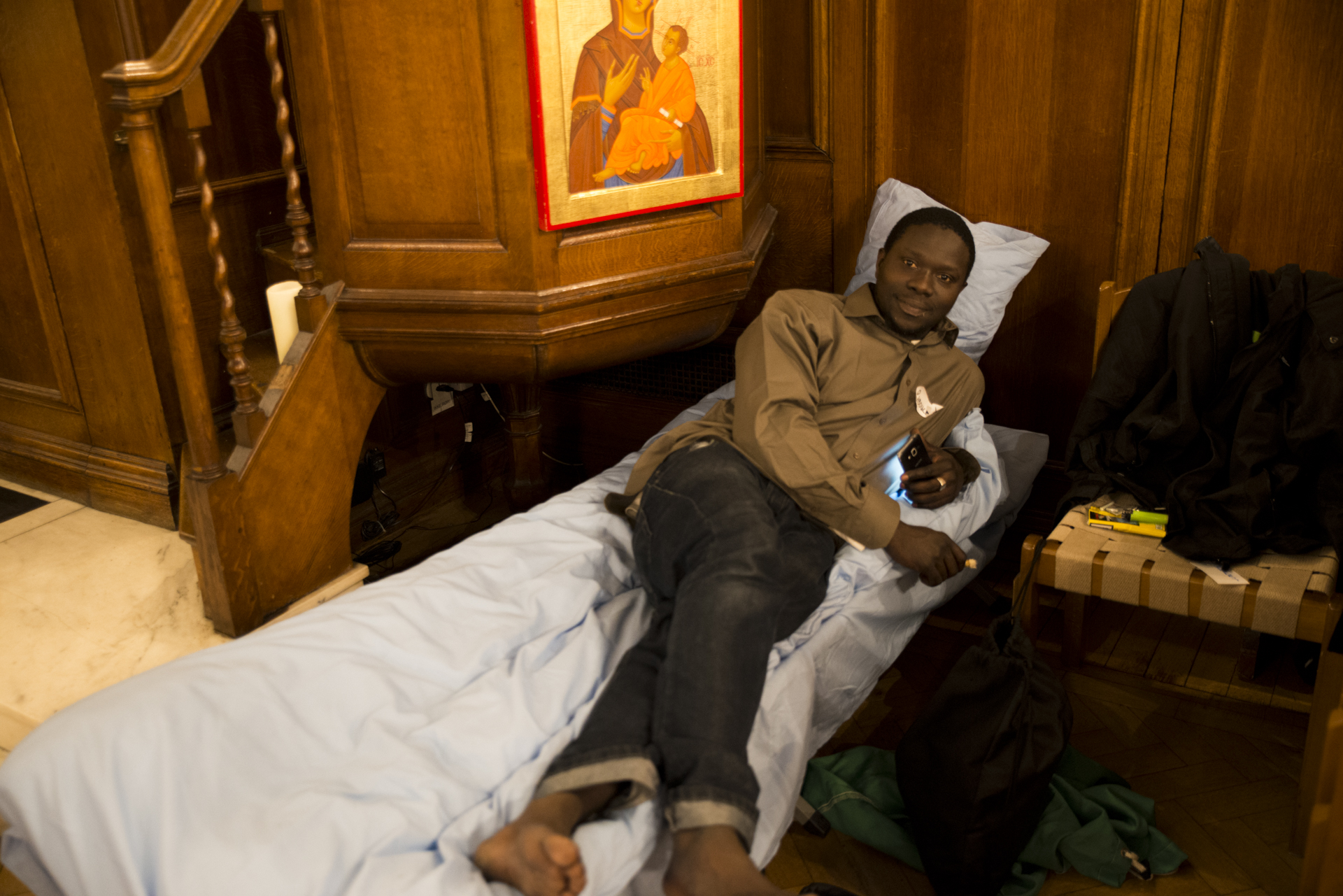 Baboucarr smiler og ser seg rundt i kirkerommet som har gitt ham en god natts søvn.