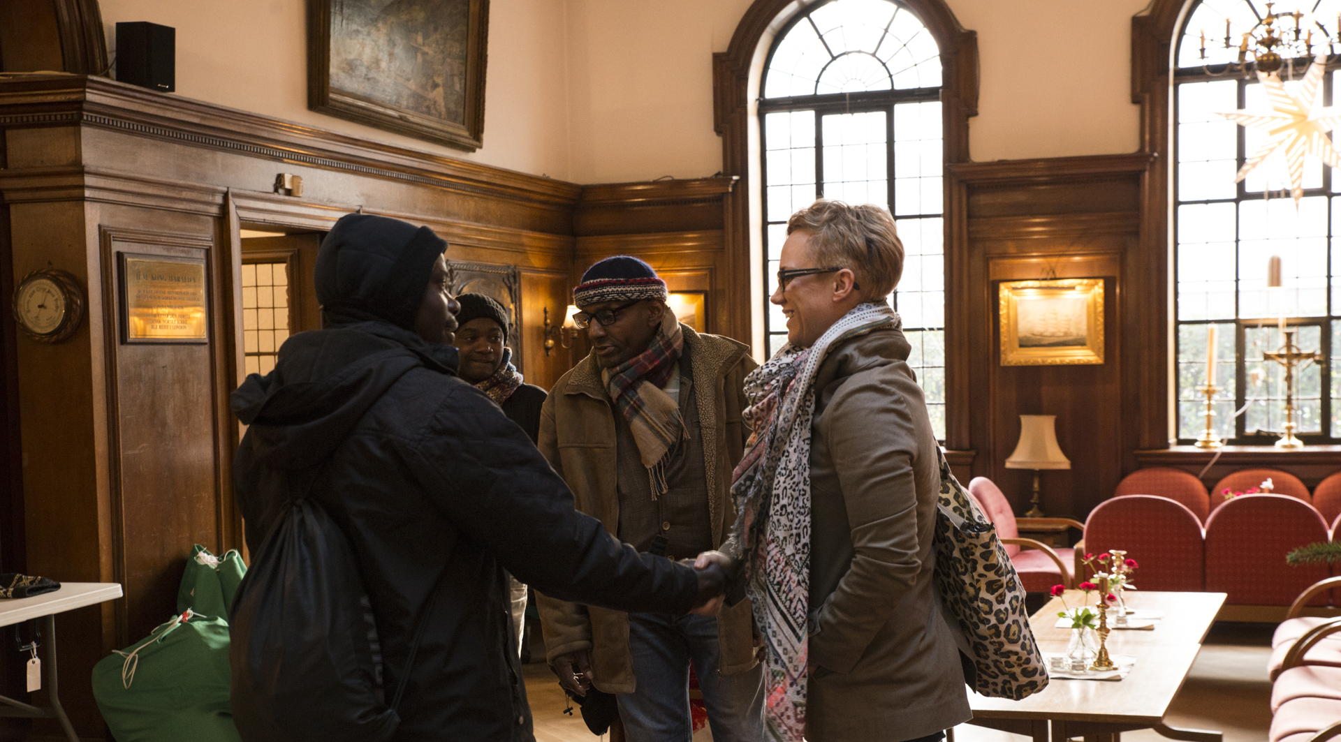 Etter hvert har de hjemløse funnet seg vel til rette i Sjømannskirken. Ross fra Tsjekkia tar pianoet i bruk. Klokken 19 serveres middagen, lekre retter plasseres på langbord midt i rommet. En etter en forsyner gjestene seg, både to og tre ganger. Mange er sultne og slitne etter lange dager ute i London-kulden.