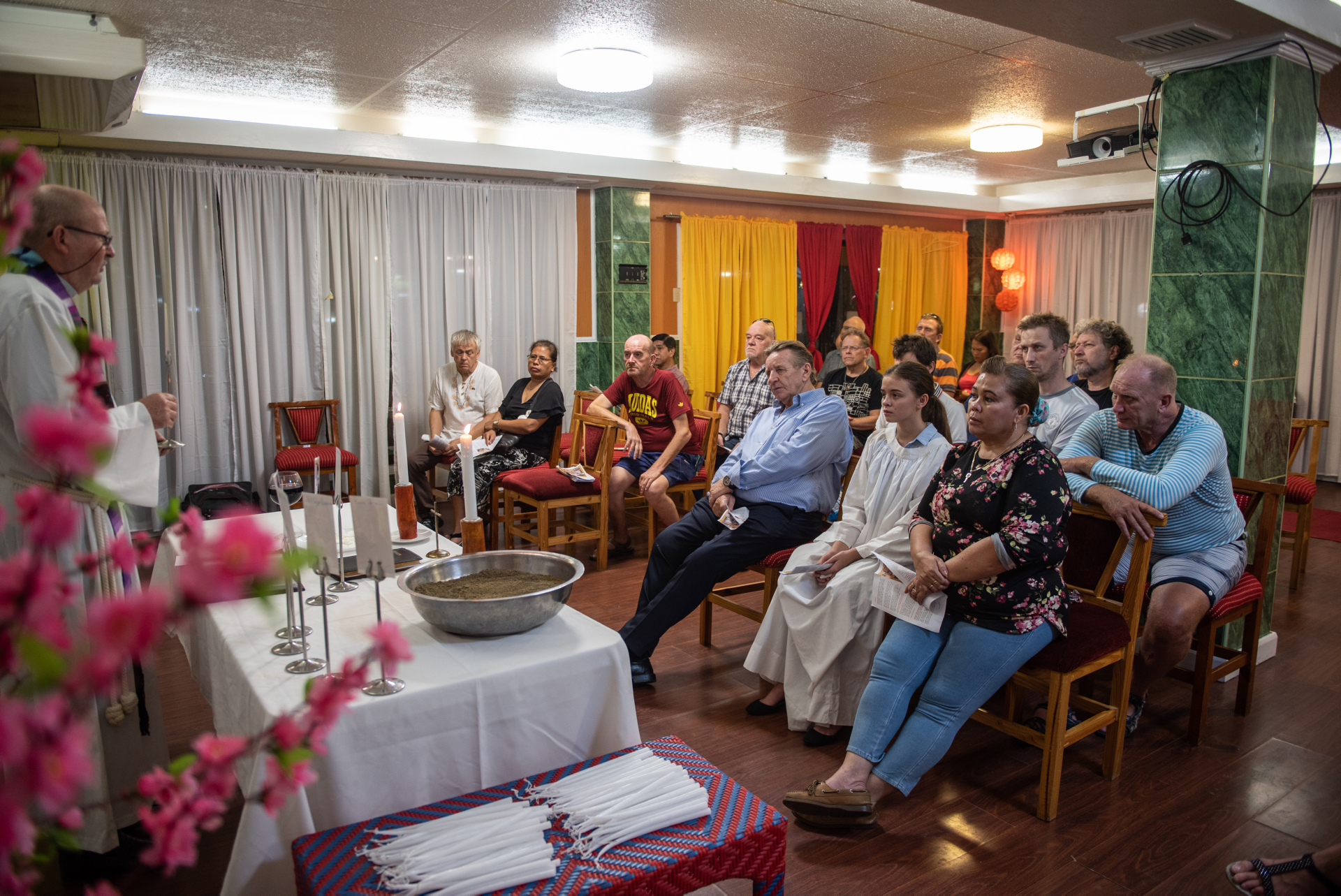 Sammen med rundt 40 andre, hvor halvparten er filippinske ektefeller av nordmennene, setter bergenseren seg på en av stolene i det provisoriske kirkebygget.