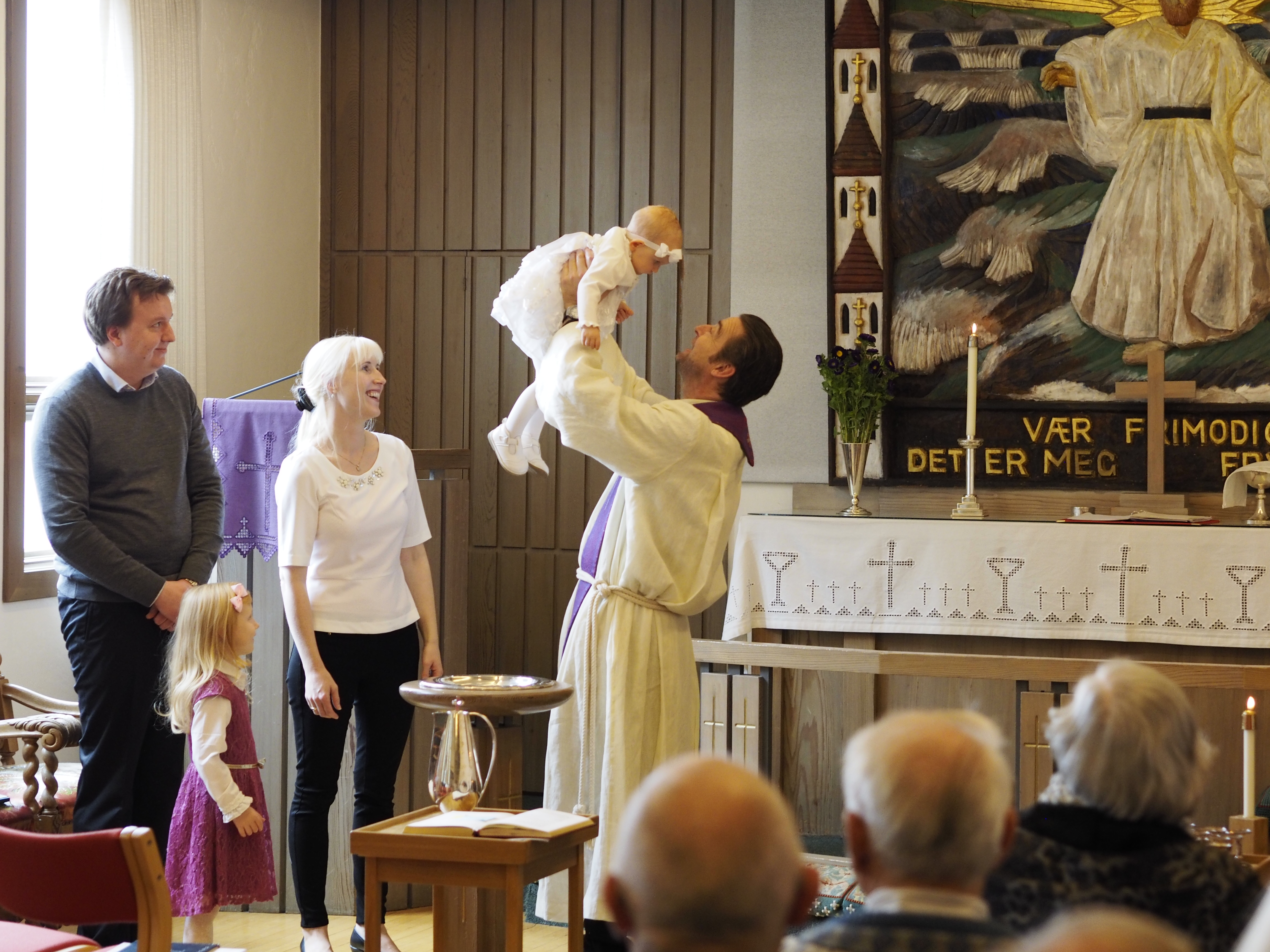 – Det er jo litt annerledes å ikke ha storfamilien rundt oss, sier Veronica Myrseth. På fanget hennes sitter datteren Alicie i hvit dåpskjole.