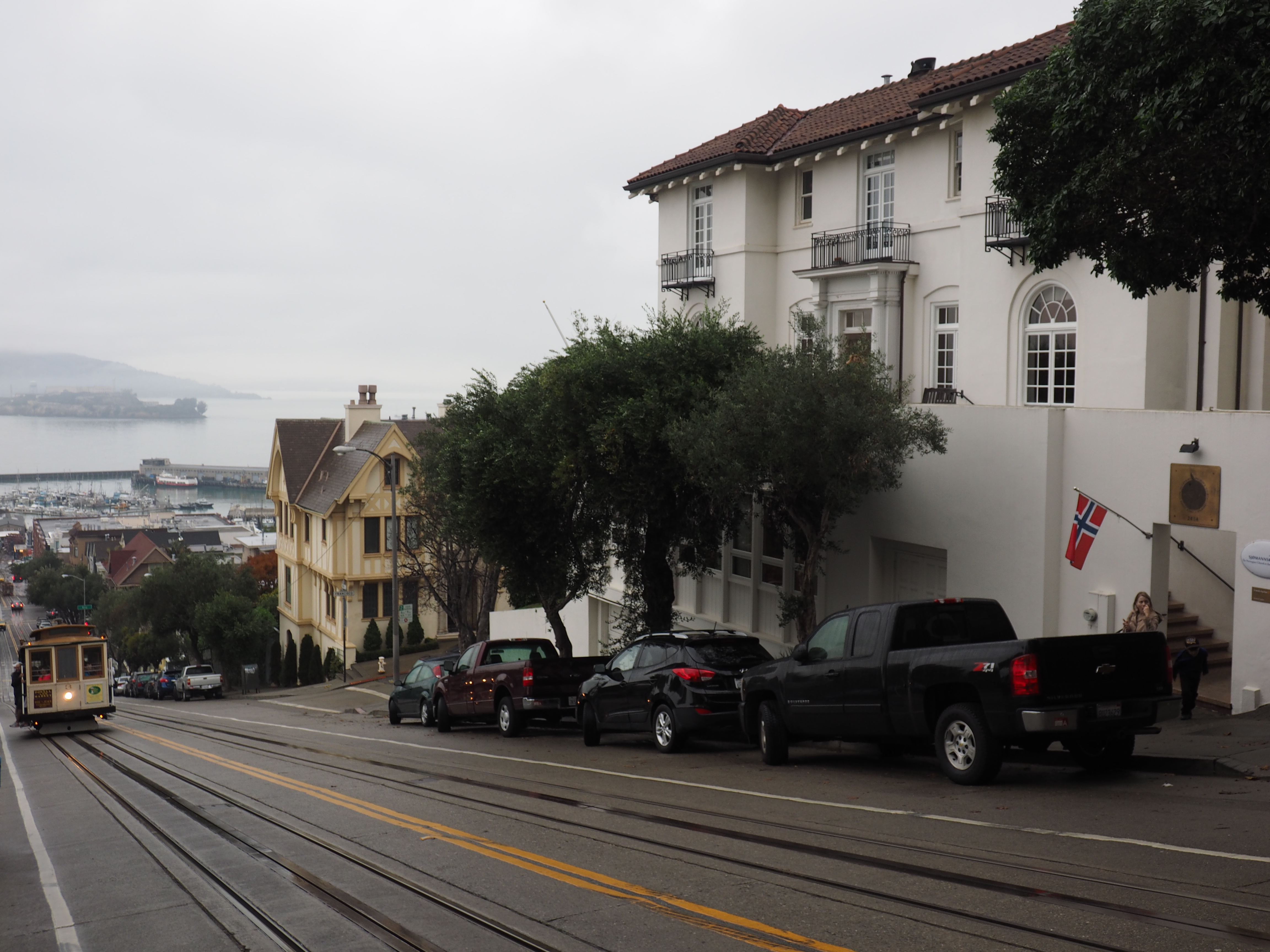 Mens trikken skrangler seg oppover den 21 grader bratte bakken til Russian Hill, stiller turister seg opp for å fange et av de klassiske motivene fra San Francisco: Den gamle kabeltrikken, havna og fengselsøya Alcatraz. Og til høyre i bildet: Den norske sjømannskirken.