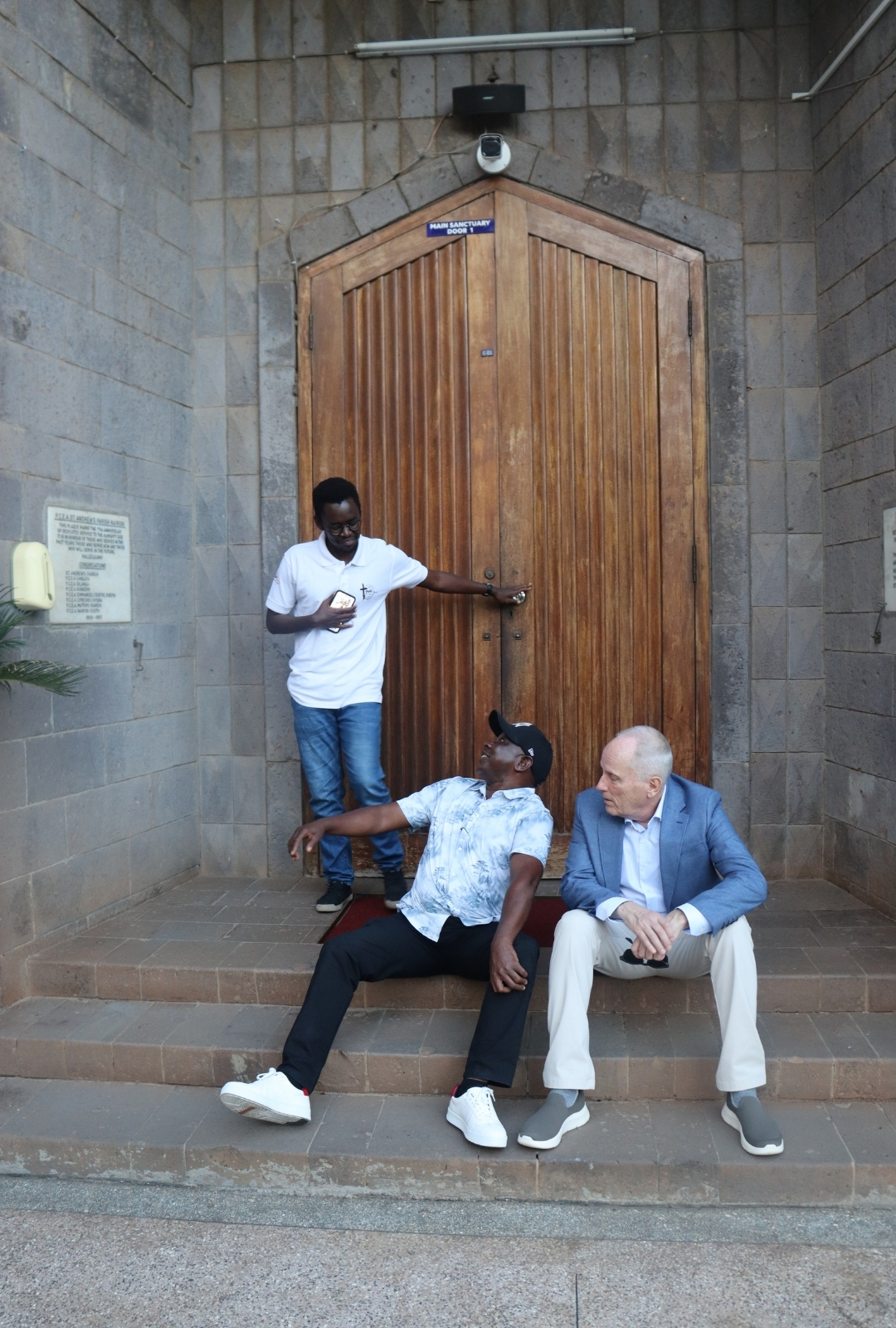 Vi går forbi et kirkebygg i Nairobi. Inngangen er bevoktet. Knut Lyngseth stopper opp og slår av en prat med vakten. En ung kenyaner kommer bort til ham og spør hvor han er prest.