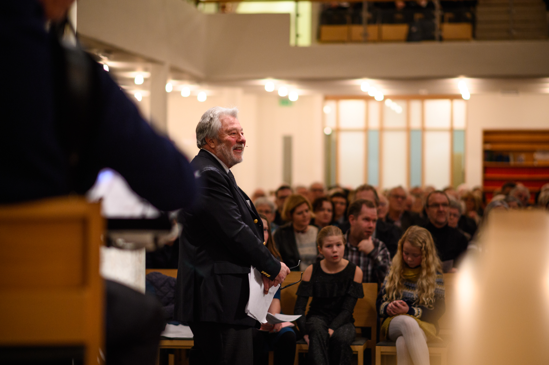 FULL KIRKE. Selv om det fortsatt er 40 minutter til sangkvelden starter, har kirken begynt å bli fylt opp. Veldig mange av de som kommer har en tilknytning til Sjømannskirken og nesten alle har en tilknytning til havet utenfor. Noen har vært med i en sjømannskirkeforening. Noen er sjøfolk. Andre har vært sjøfolk. Noen jobber i et rederi. Andre er gift med noen som jobber i et av rederiene. Ole Dagfinn Sky går rundt i lokalet. Hilser på kjentfolk og kikker på klokka. Endelig kan sangkvelden starte. Han berører dressjakken med høyre hånd. Der henger Kongens fortjenstmedalje som Sky ble tildelt sommeren 2018.