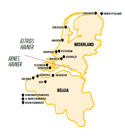 TODELT REISETJENESTE. Om lag ti mil lenger sør, ved kysten i Belgia, er Arne Bakkedal på vei til havnen i Zeebrugge. Han er den andre halvdelen av reisetjenesten i Europa. Øksnes Stenholt har base i Rotterdam, mens Bakkedal har base i Antwerpen. Fra sine baser besøker de en rekke havner i hvert sitt område.