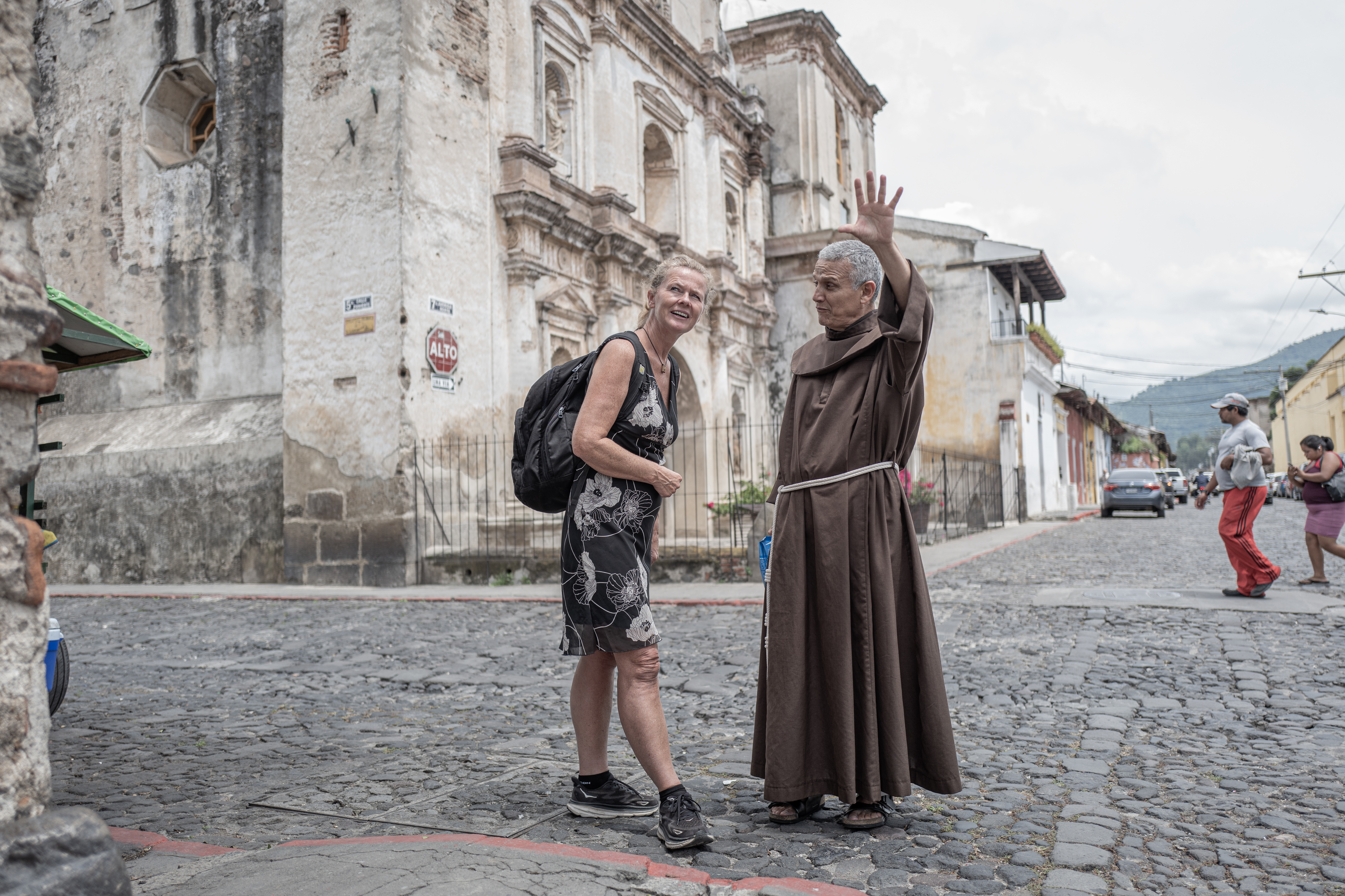 Det er flere tusen meter ned til havet der vi sitter på bussen som skal ta oss opp til Antigua. Der har den ambulerende sjømannspresten fått kontakt med en nordmann, og hun har avtalt å møte ham på en restaurant i byen.