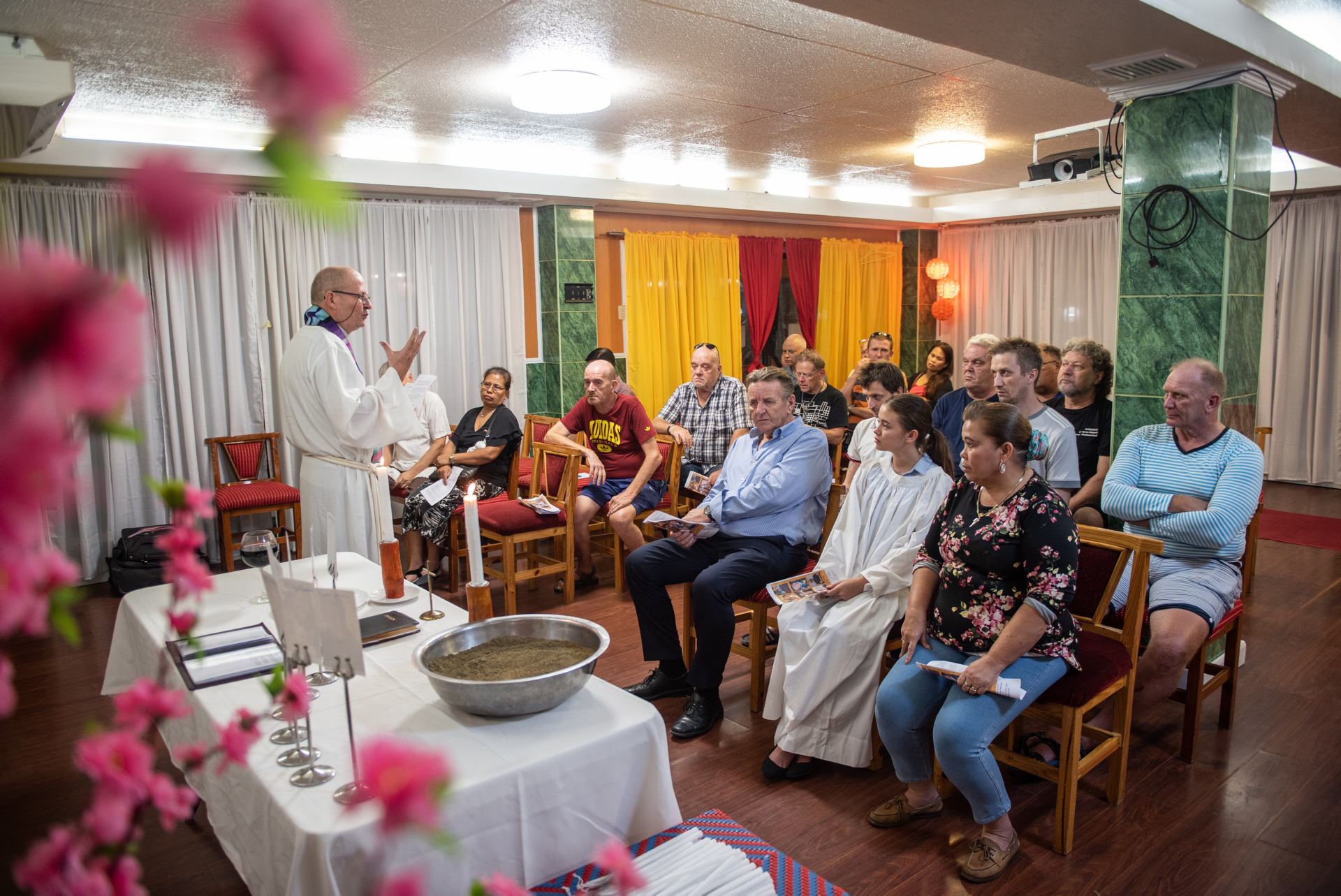 Det var ikke en ledig stol i lokalet da sjømannspresten ønsket velkommen til 17. mai-gudstjenesten. Han var minst like spent som Sofia da han informerte om nattverden som skulle finne sted for første gang. Til de filippinske som var til stede forklarte Vangen at den protestantiske kirken tenker annerledes enn den katolske kirke.