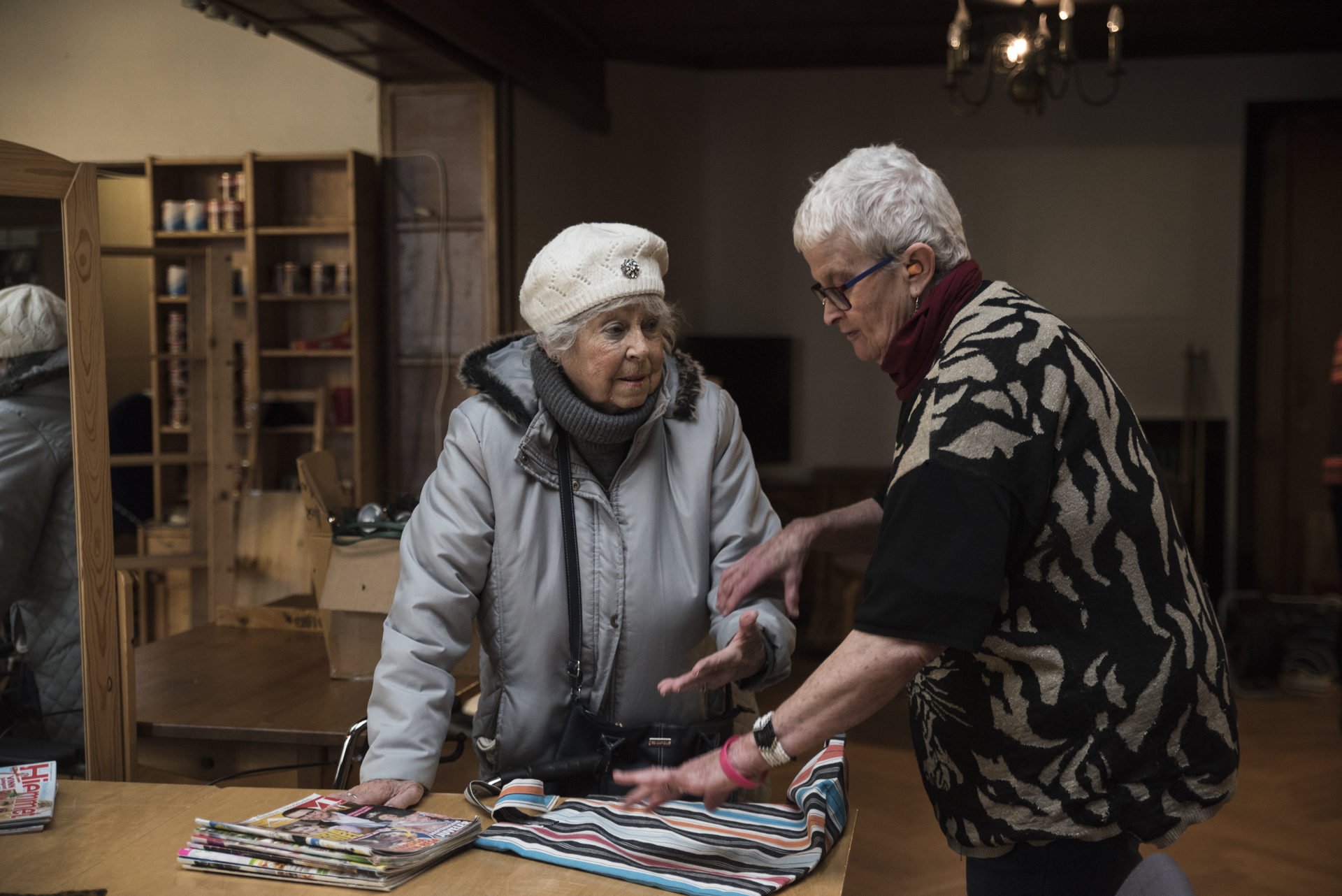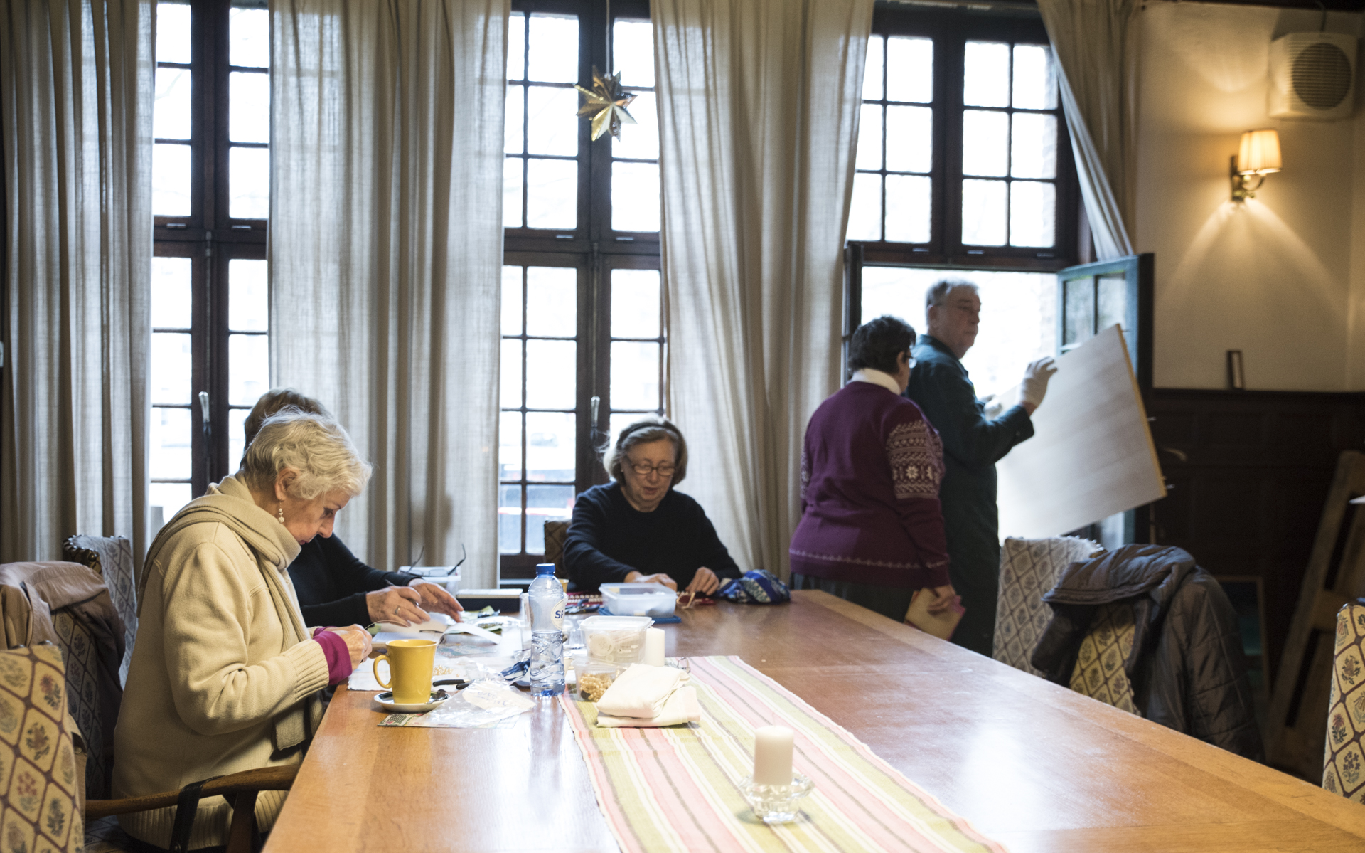 Han står utenfor vinduet og tar imot speil, reoler og mapper som havner i containeren bak ham. På innsiden av vinduet har tre damer slått seg ned ved det såkalte trailerbordet– slik de har gjort hver tirsdag så lenge de kan huske. Perler, tråder og avbitertang er funnet frem. Mens de ansatte flytter på møbler og kasser rundt dem går de i gang med det langsomme arbeidet det er å lage smykker til julebasaren.