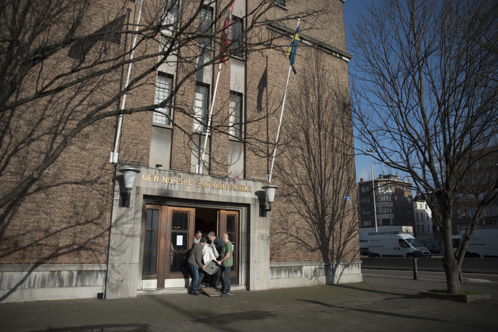 Varebilen parkerer utenfor et flunkende nytt bygg hvor steinarbeidere holder på dunke på plass de siste brosteinene ved inngangspartiet. Den nederste hjørneetasjen, trolig en tredjedel av størrelsen til den gamle kirken, vil bli Sjømannskirkens nye hjem i Antwerpen.