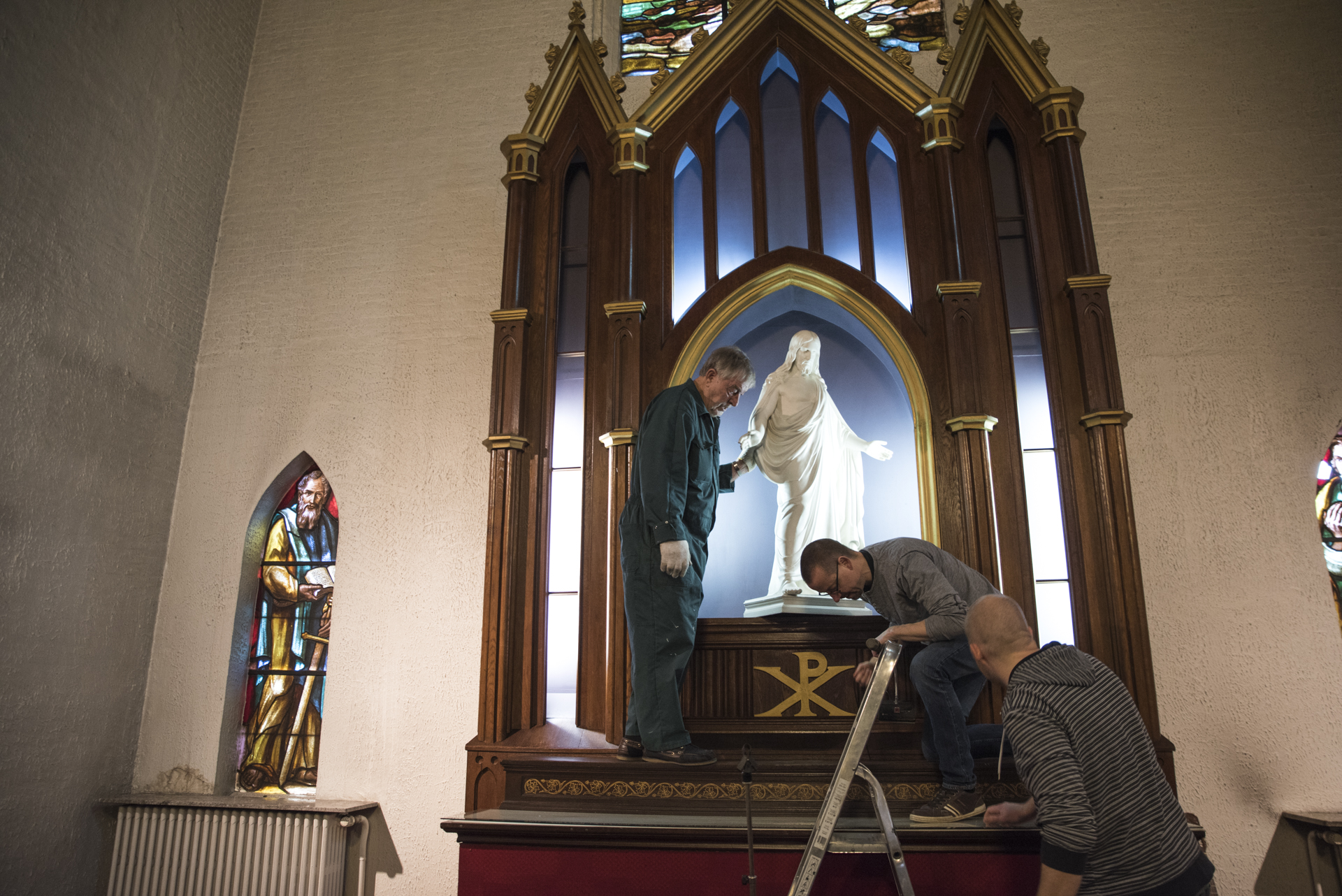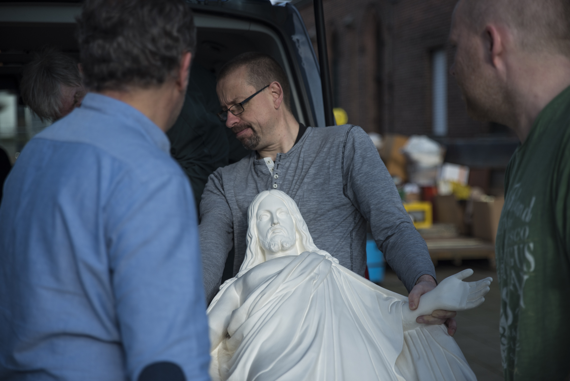 Litt mindre nervøse for å ødelegge et historisk objekt, bærer mennene den 60 kilo tunge og halvannet meter lange metall-statuen nedover altergangen, forbi håndverksgruppen, trailerbordet med smykkedamene og ut i det fri. Han får nyte vintersolen i ett minutt før han legges i en pappeske i Sjømannskirkens varebil.