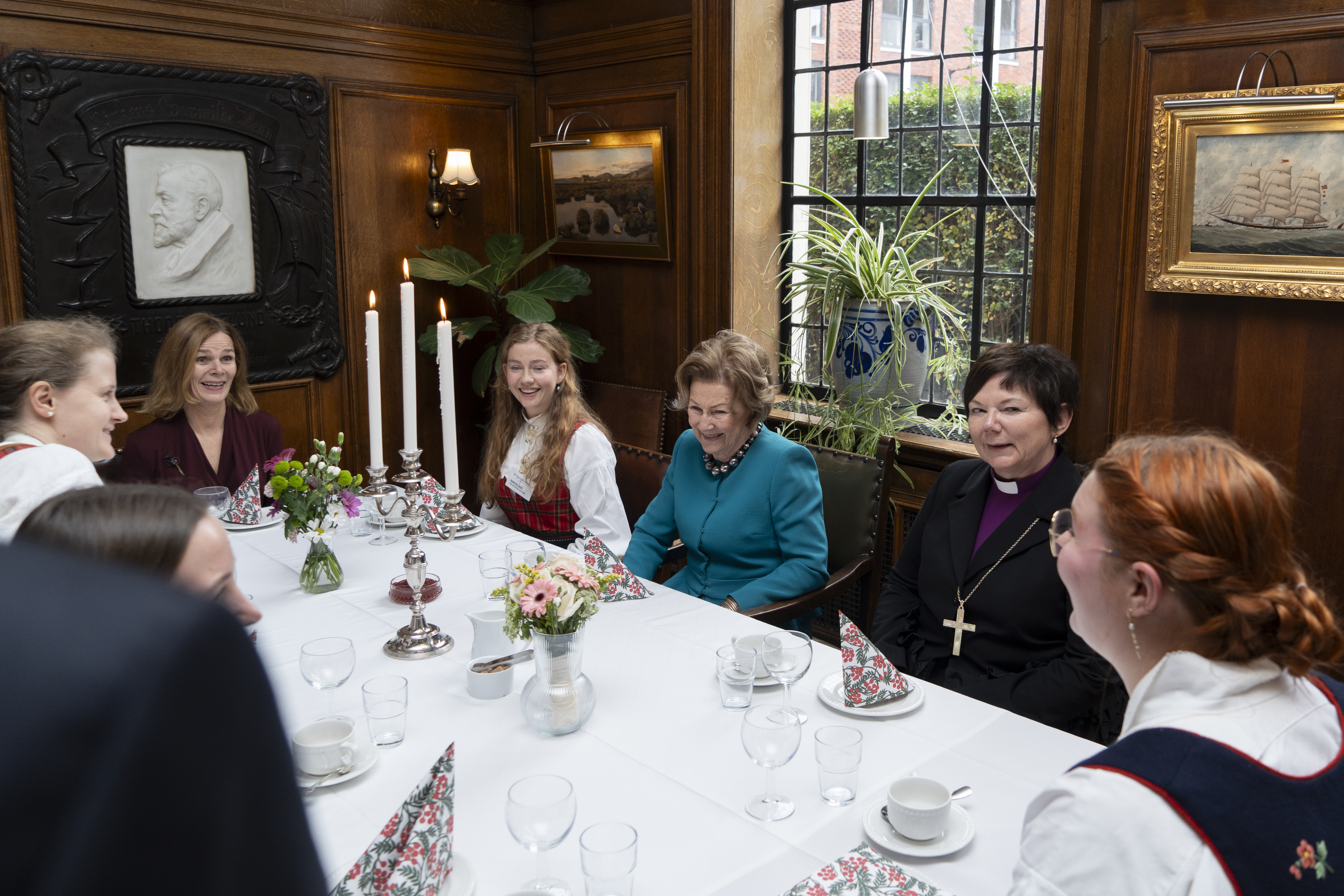 Praktikant på Sjømannskirken i Lonodn Nikoline Vadseth sammen med Dronning Sonja under kirkekaffen.
