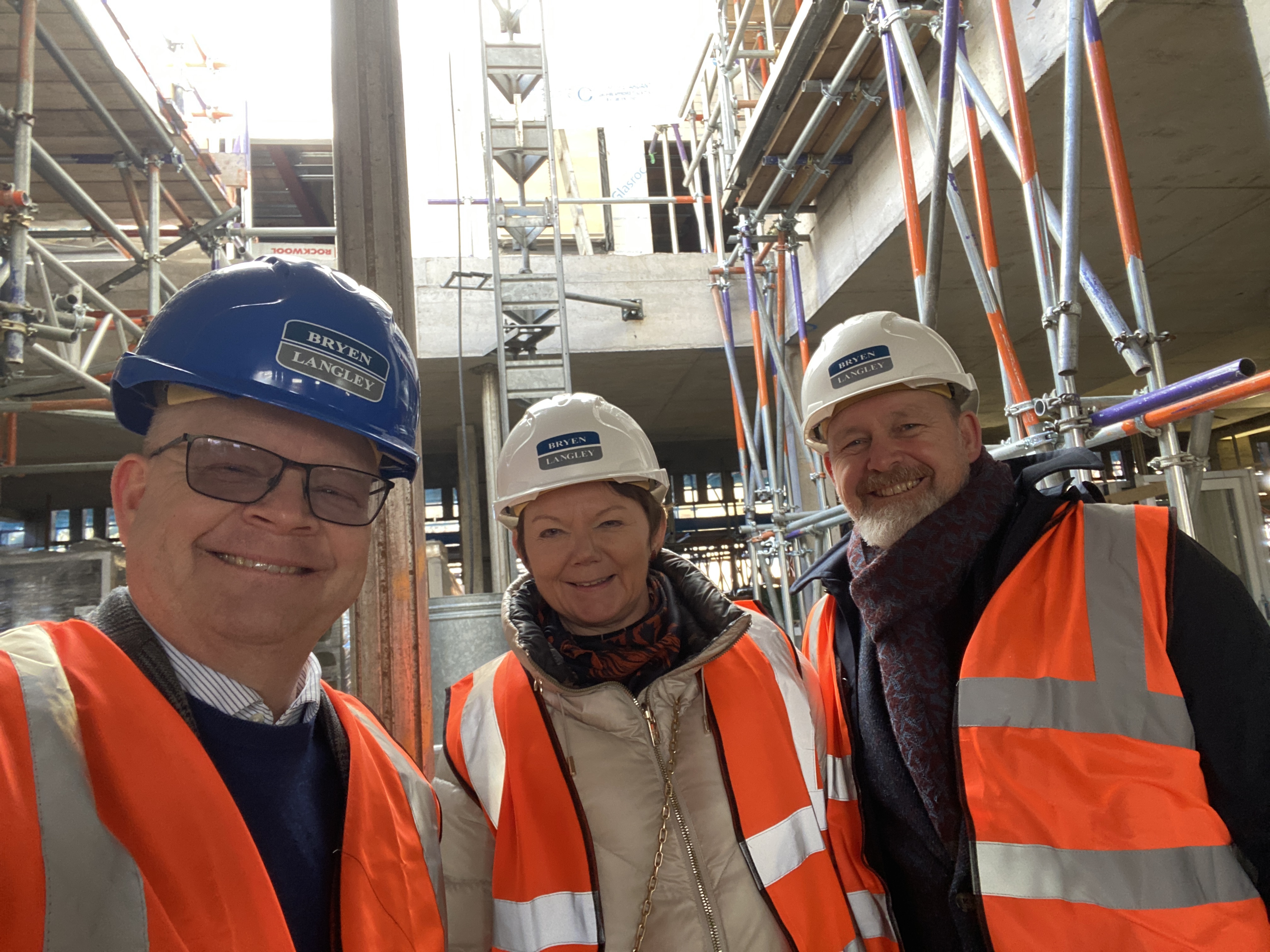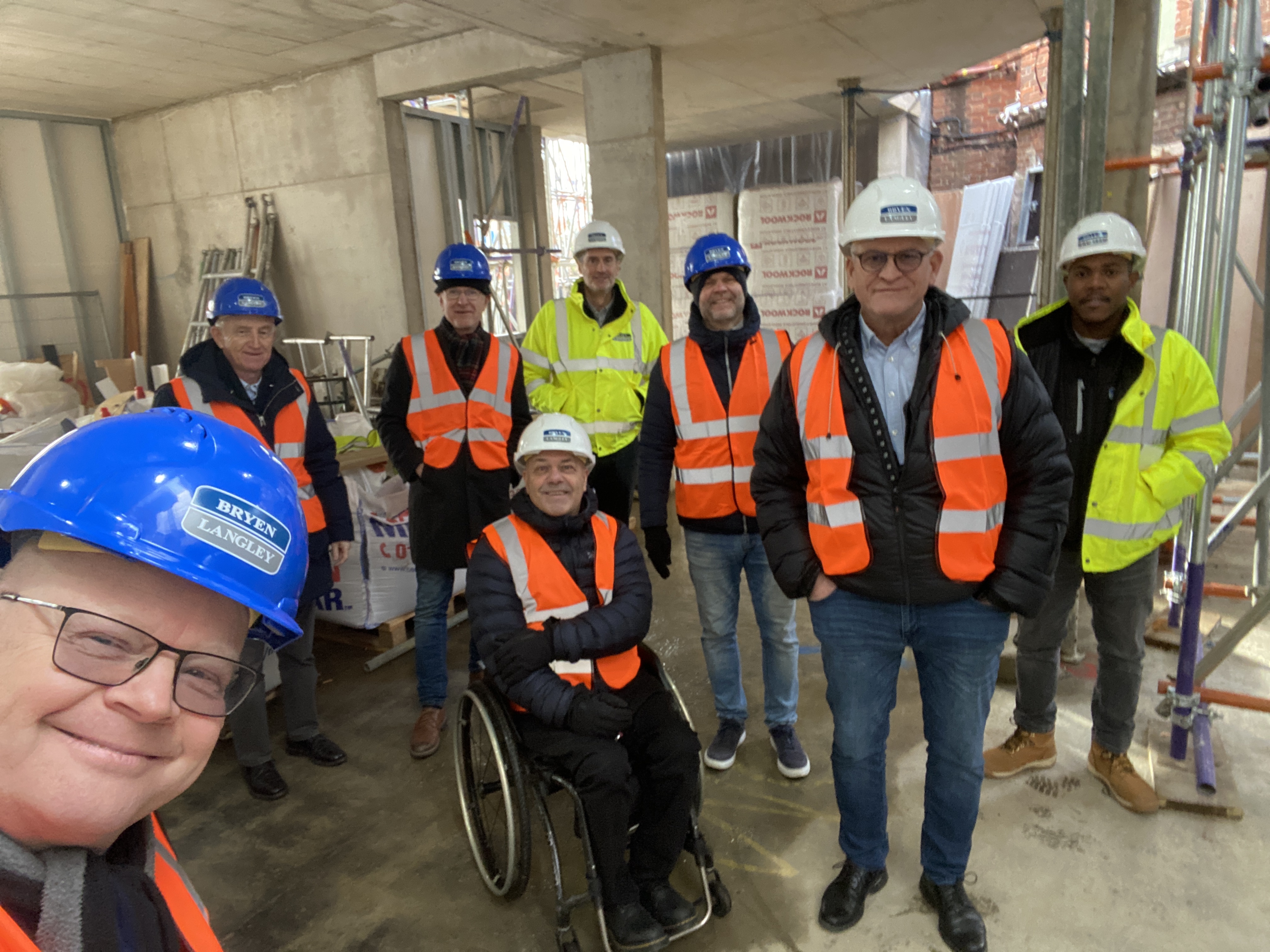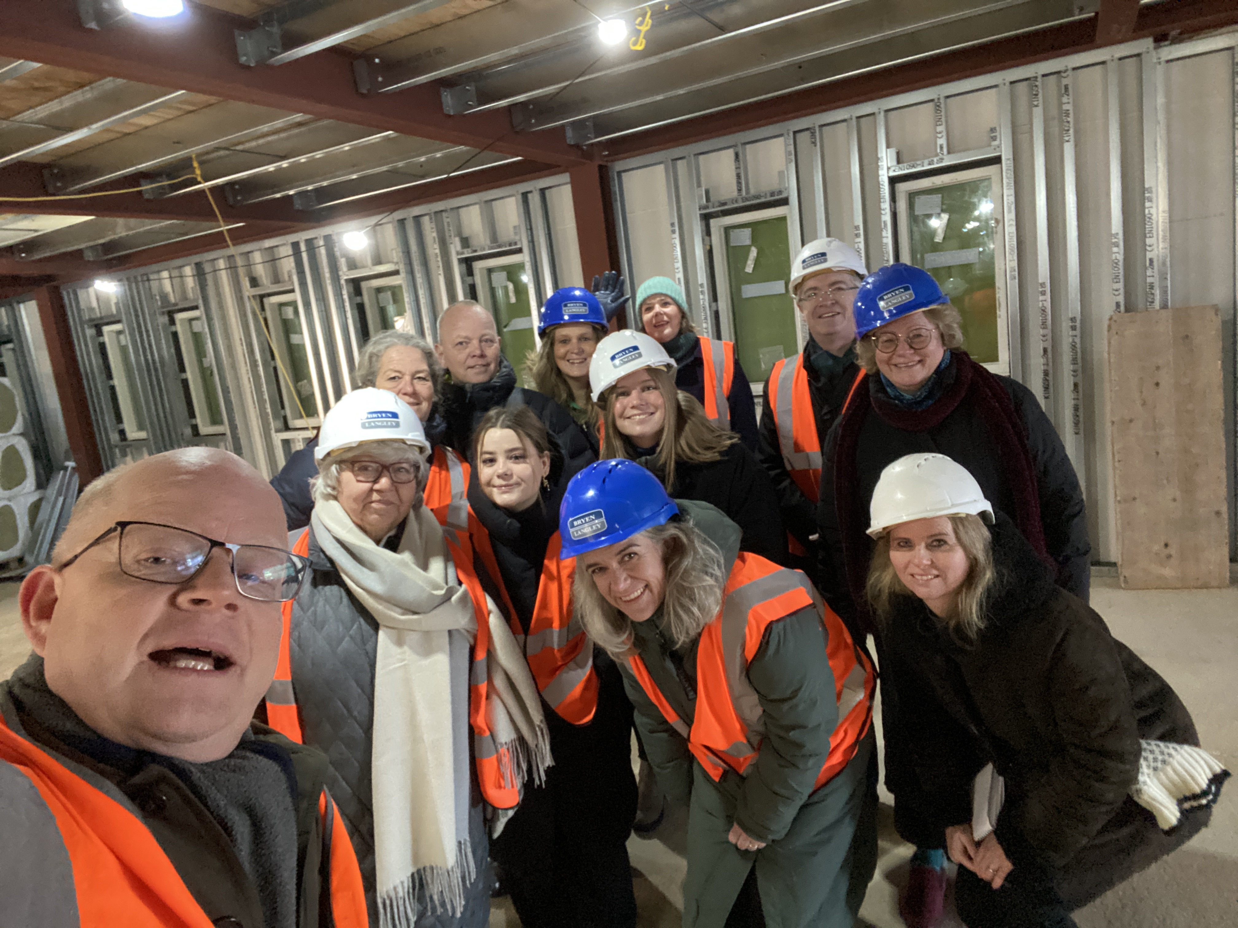 Ledelsen fra Hovedkontoret i Bergen besøkte byggetomten i desember 2023. Fra venstre:daglig leder Dag Magnus Havgar, kirkens byggeinspektør Paul Hands-Wicks, prosjektmedarbeider Dennis Larsen, økonomisjef Hein Kvalheim, byggeleder fra Bryen-Langley Jim Nightingale, operativ leder Espen Ingebrigtsen, generalsekretær Jeffrey Huseby og Site Manager fra Bryen-Langley Vinton Thomlinson.