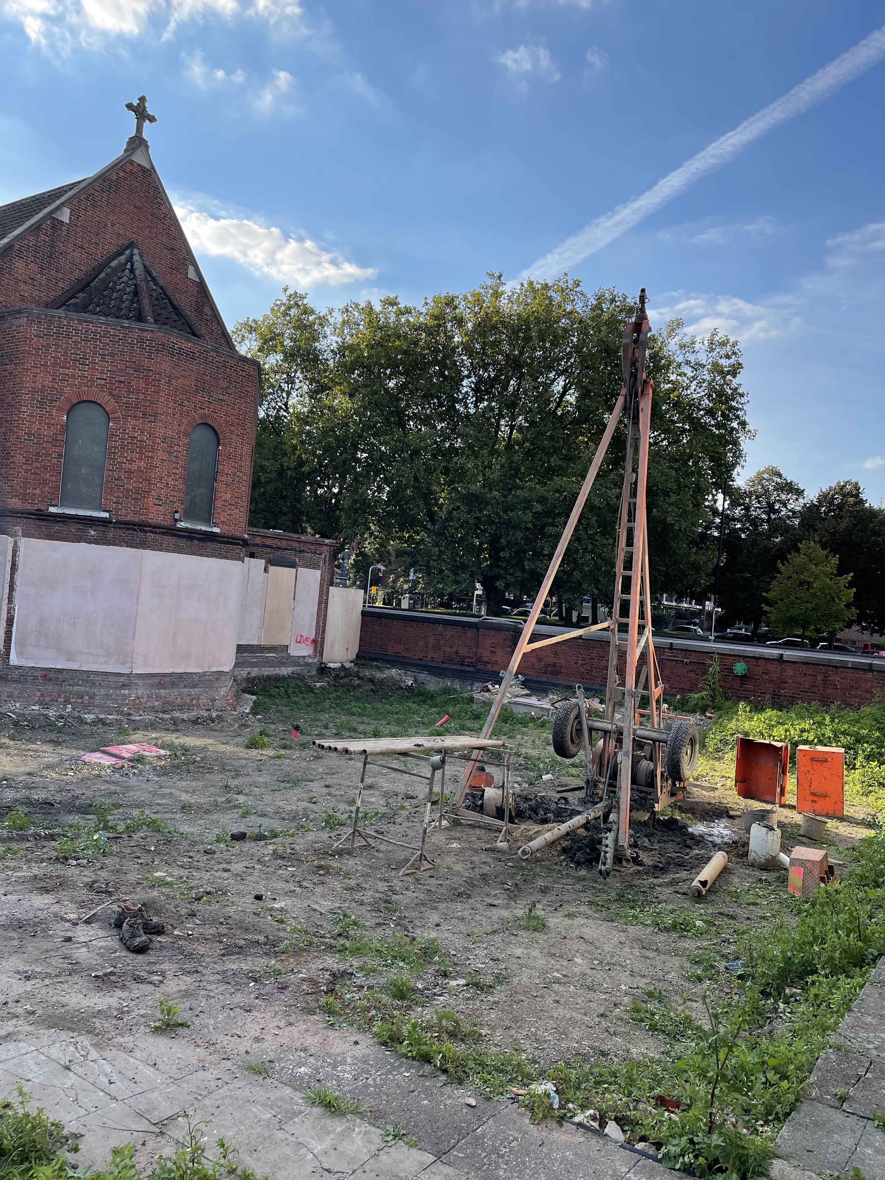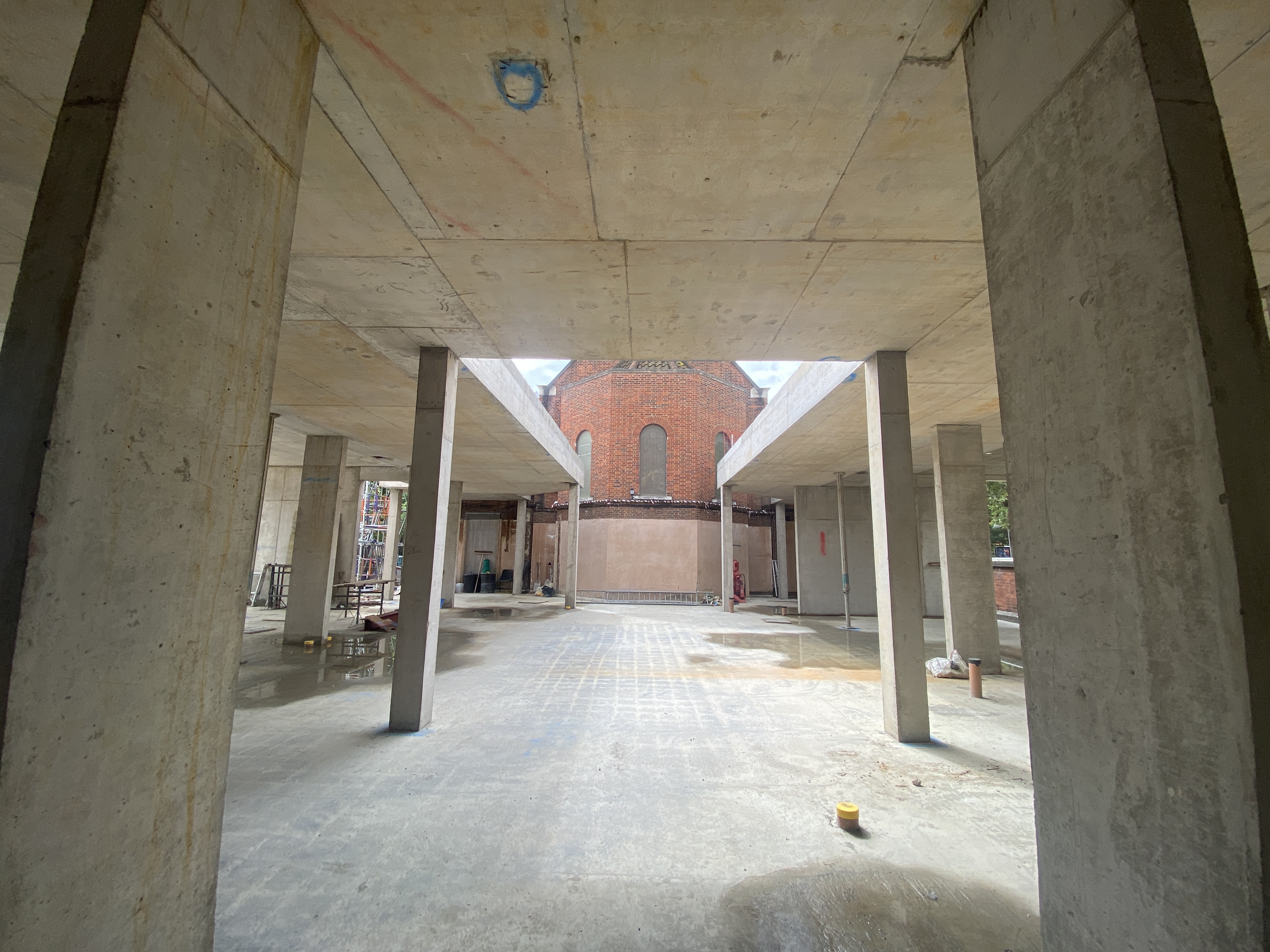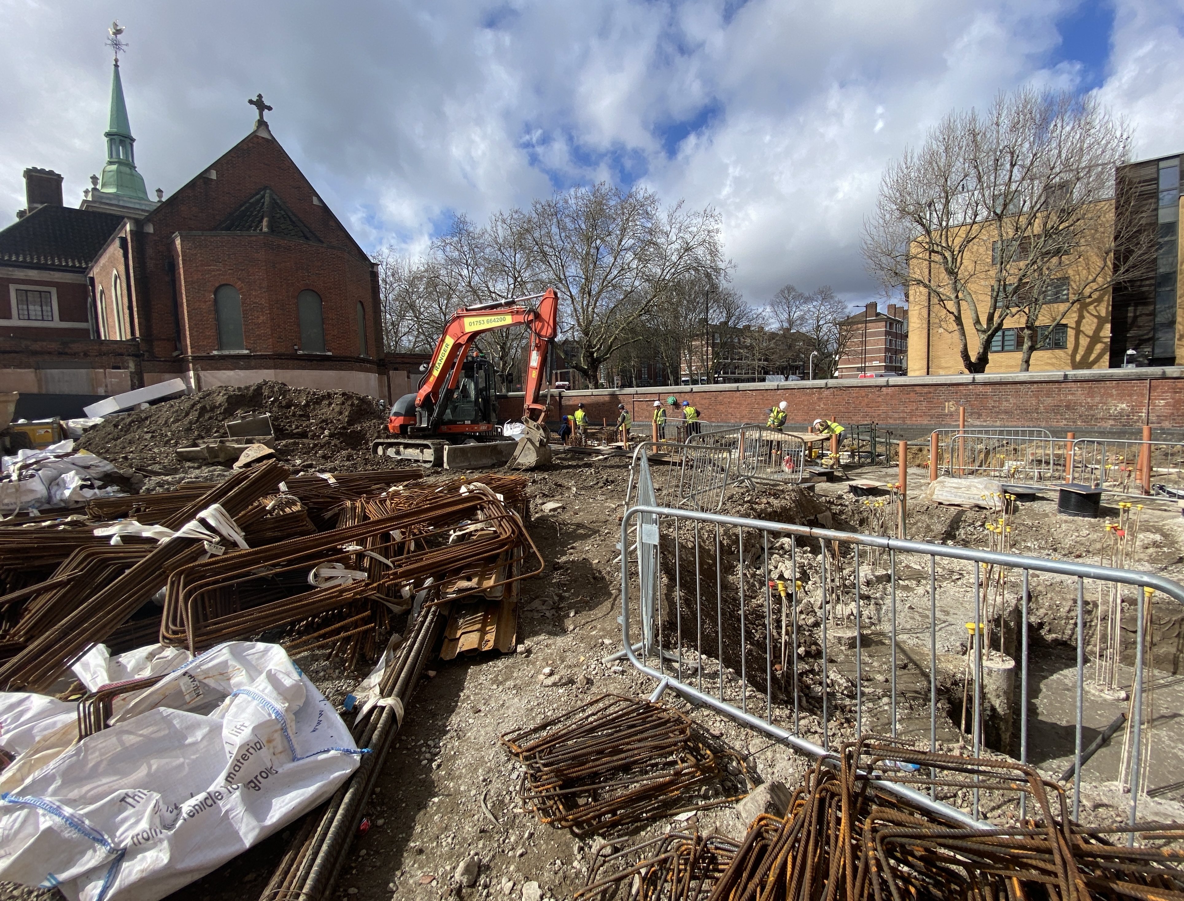 Det som tar lengst tid, er det som synes minst. Grunnarbeidene har vært omfattende og pågått gjennom hele mars og april. Endelig begynner det å synes mer over bakken og ta form av at vi nærmer oss at betongsålen legges. Fordi det skal bygges på hele tomten, har entreprenøren reist stilas over sakristiet på kirken. Der er det nå satt to kontainere som vil være kontor for byggeledelsen.