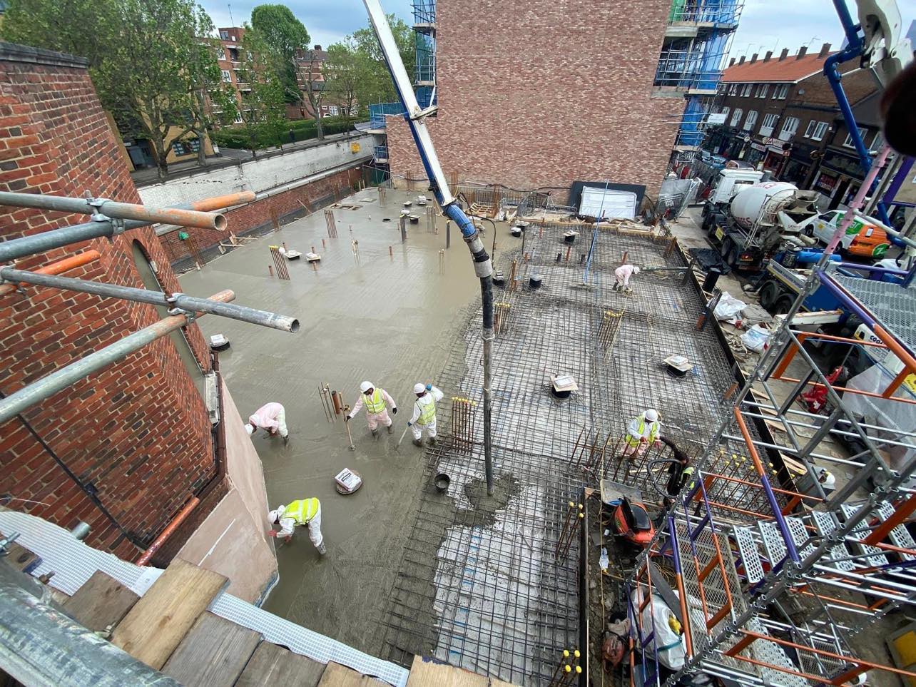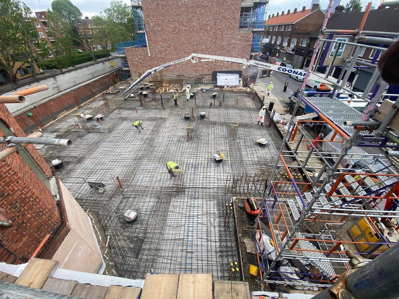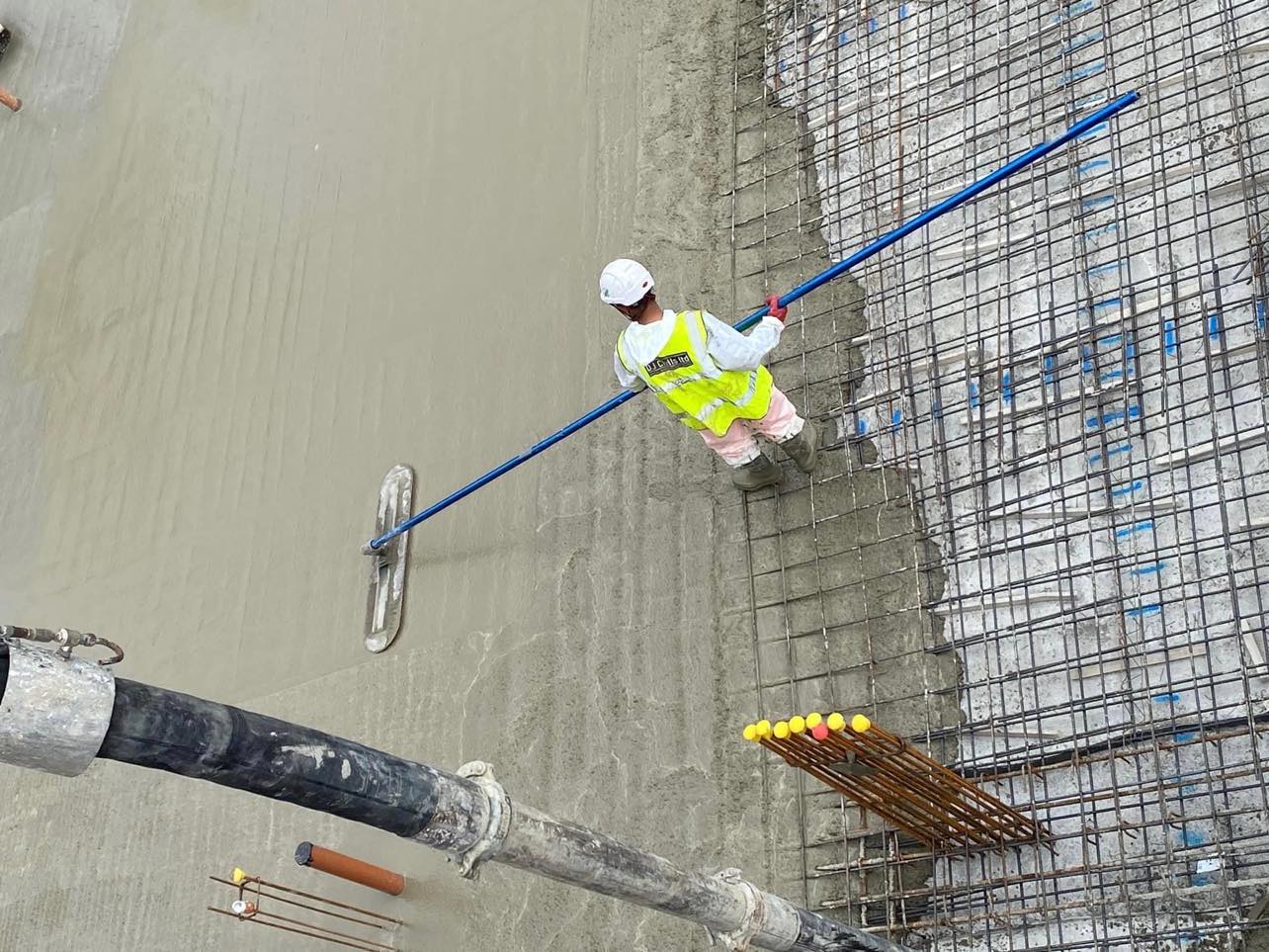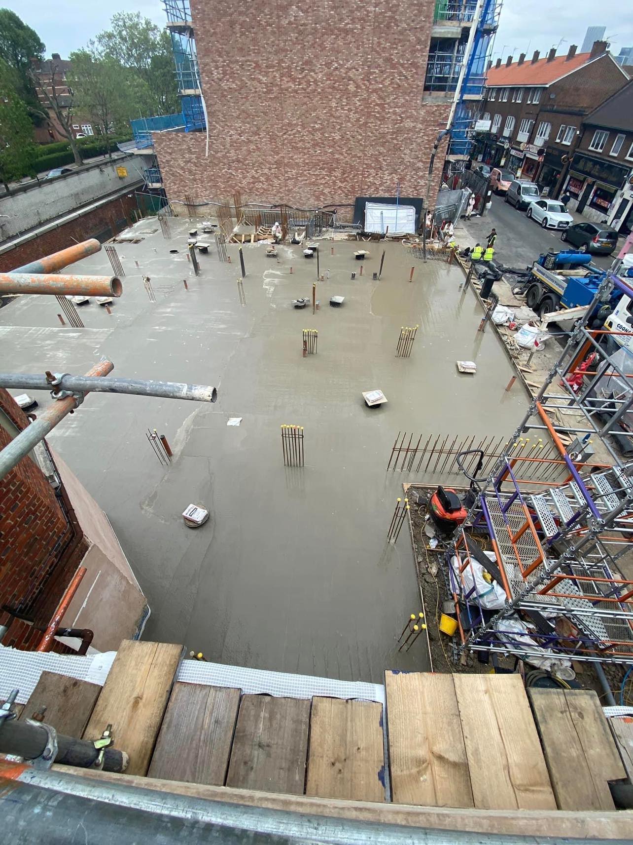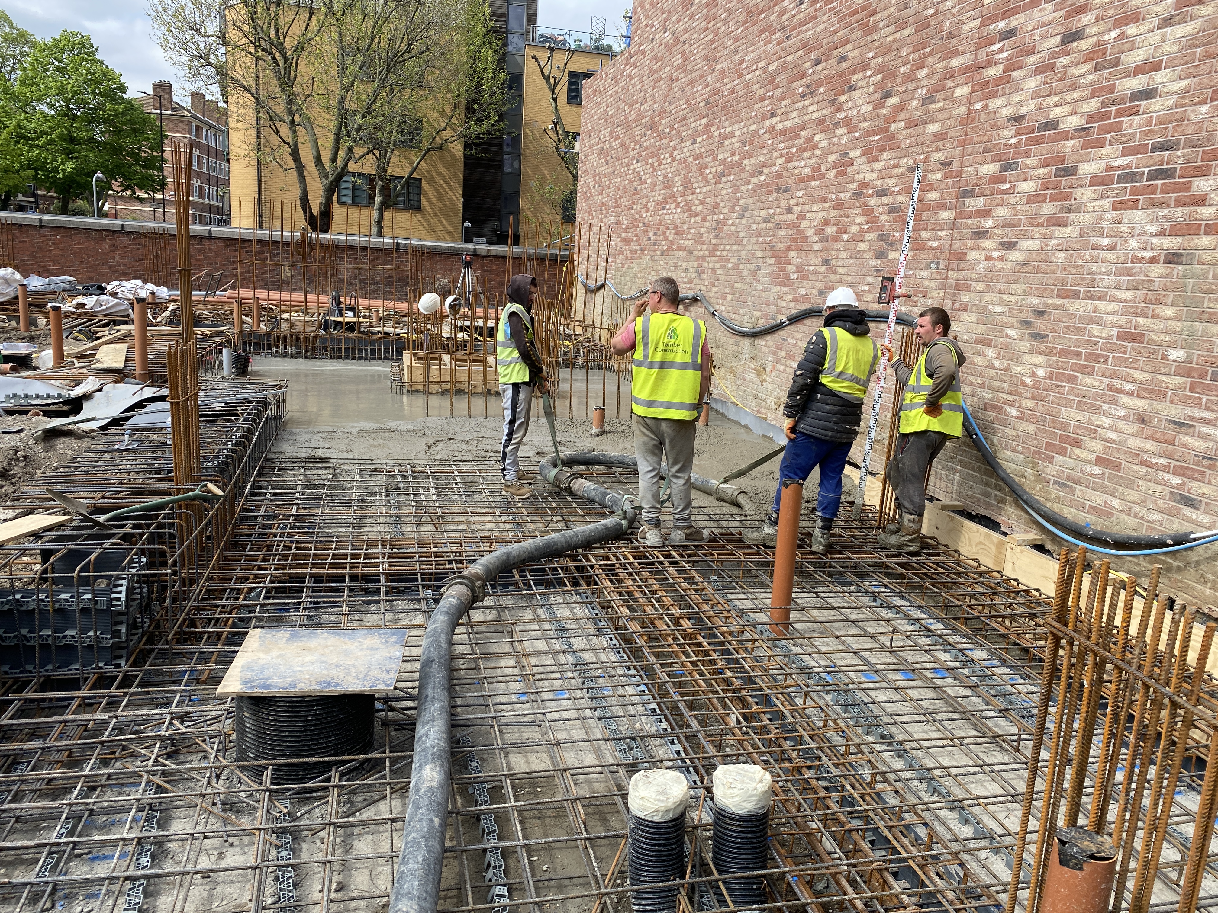 Mandag 22.mai ble endelig betongsålen til nybygget lagt. Etter en uke med tørking kunne så stolpene og bæreveggene til første etasje (norsk) / ground floor (engelsk) armeres og støpes.