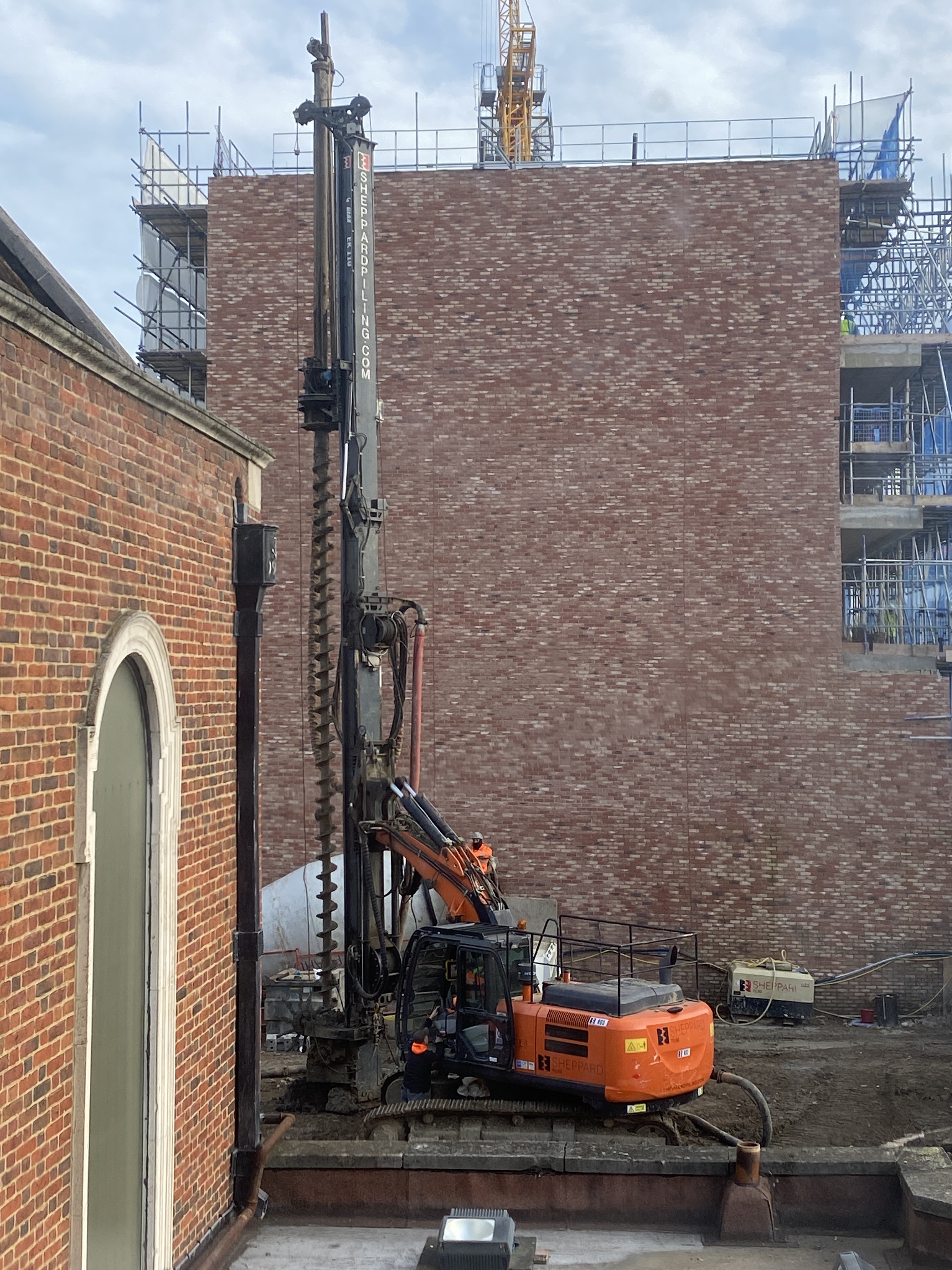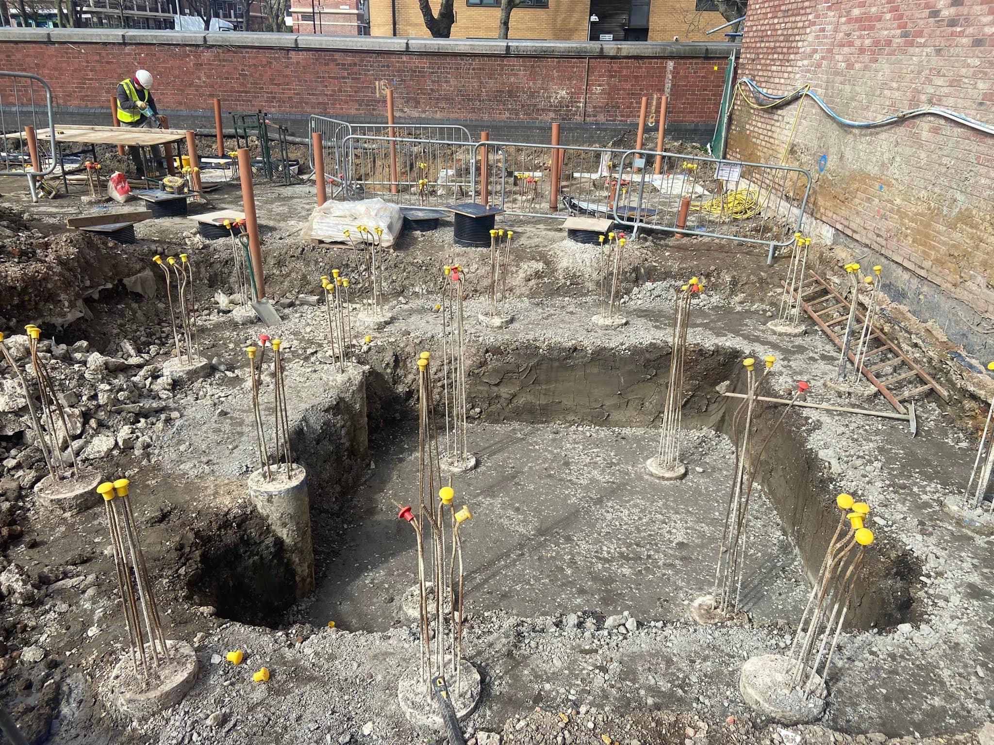 Mye planarbeid ble gjort i resten av 2021, men på grunn av pandemien og ytterligere byråkrati ble arbeidet på tomten forsinket ut i 2022. I desember var tomten klargjort og gravearbeidene kunne komme i gang. Stolpeboremaskinen og sementbiler fulgte på i januar 2023. I alt ble det boret hull til og støpt 93 stolper i bakken, 15 meter dype og 40 cm i diameter. Stolpene skal bære betongsålen som igjen skal bære bygget.