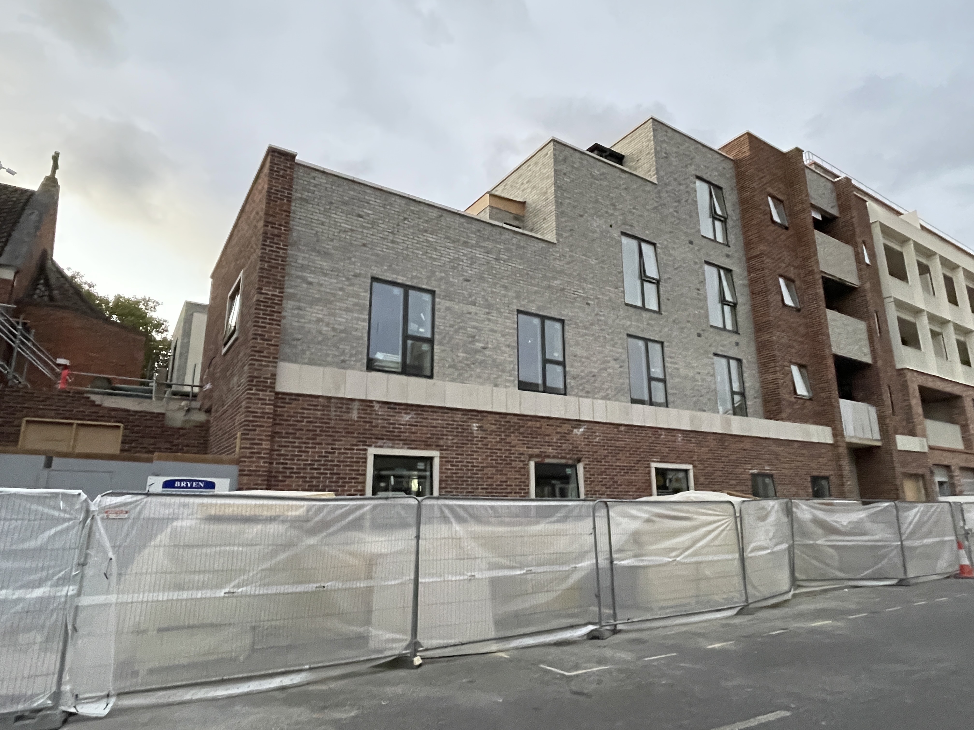 Fra andre etasje langs Albion Street i leilighetsdelen, sett mot kirken.