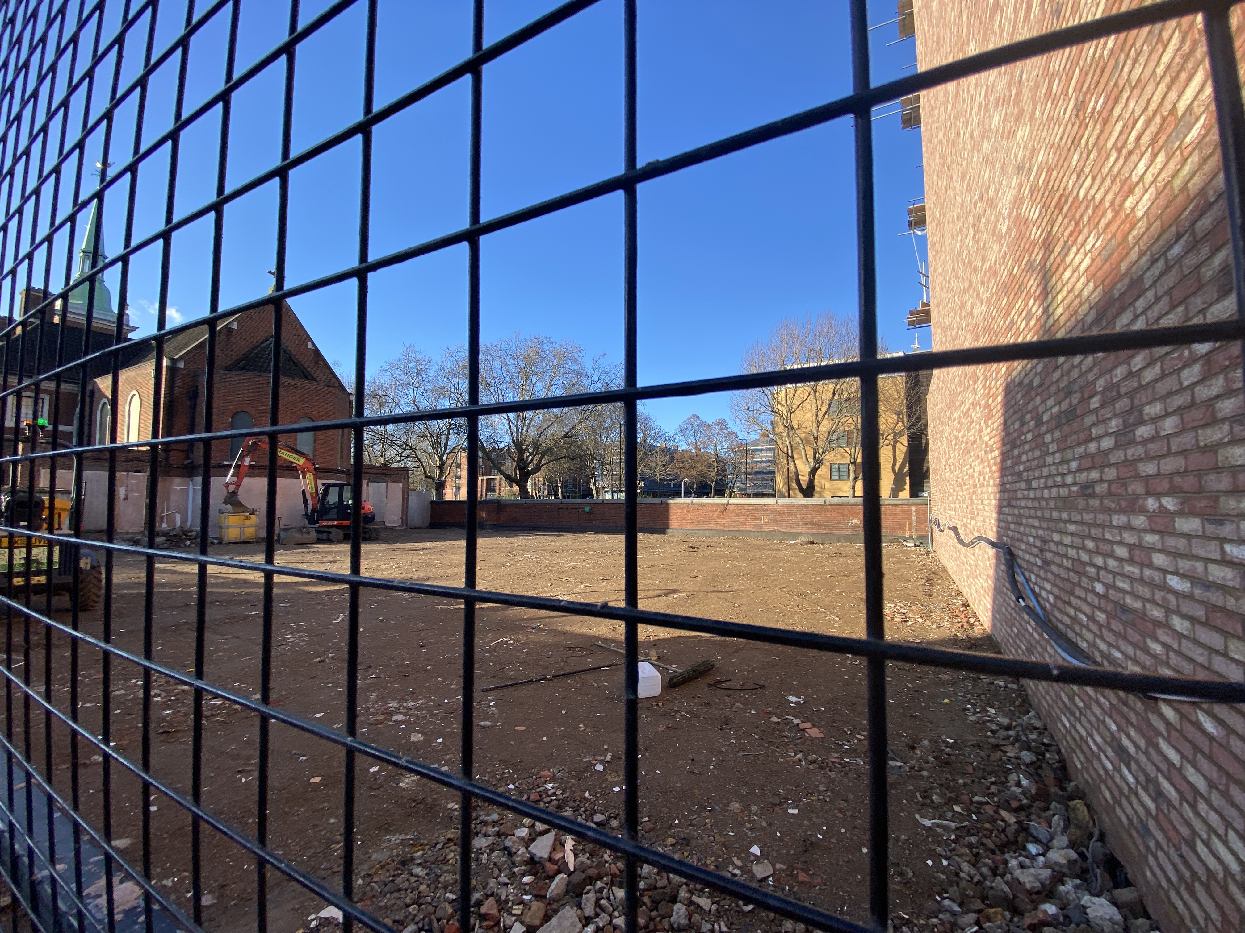 Oversiktsbilde fra det nye byggekontoret. Fordi det ikke er noe plass utenom byggeområdet for verktøy og maskiner å arbeide fra, har graving, drenering, rørlegging og armering måttet foregå del for del på tomten.