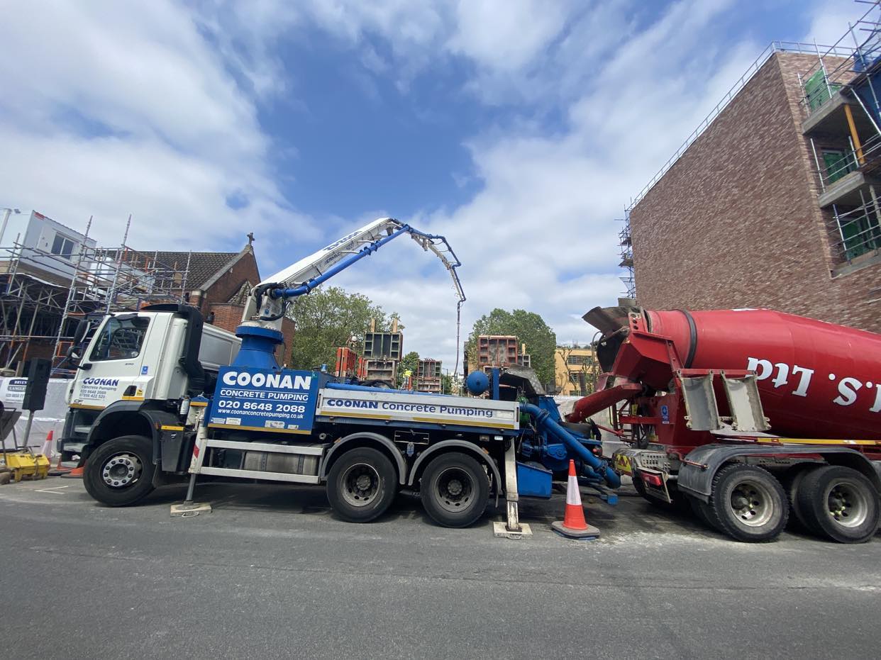 Sementbiler kommer fortløpende og kobles til bilen med fylleslange.