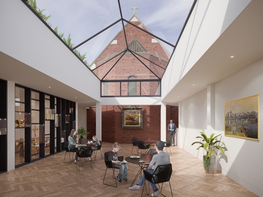 Utsikt fra taket på nybygget ned mot atriet, som vil få glasstak.