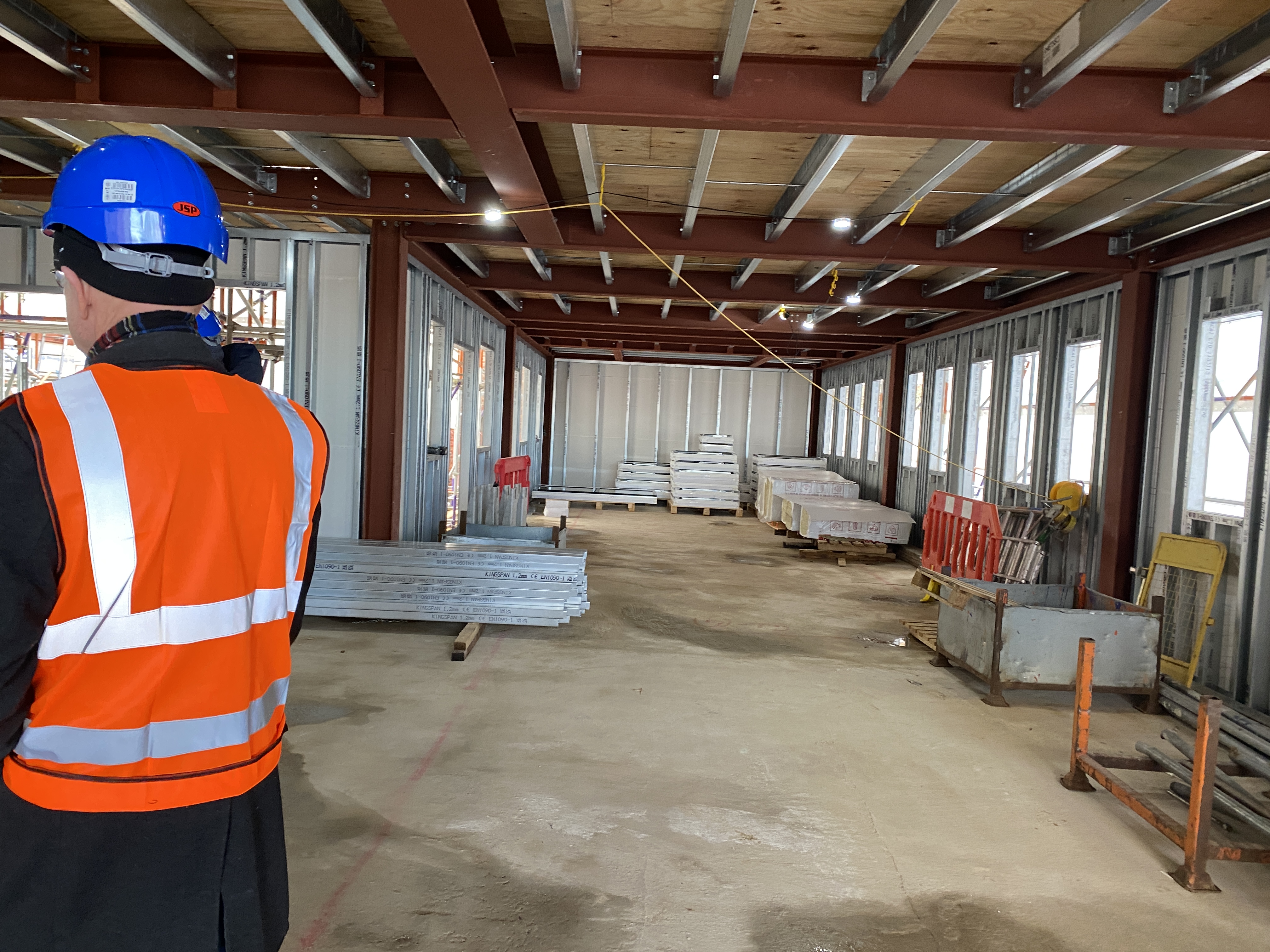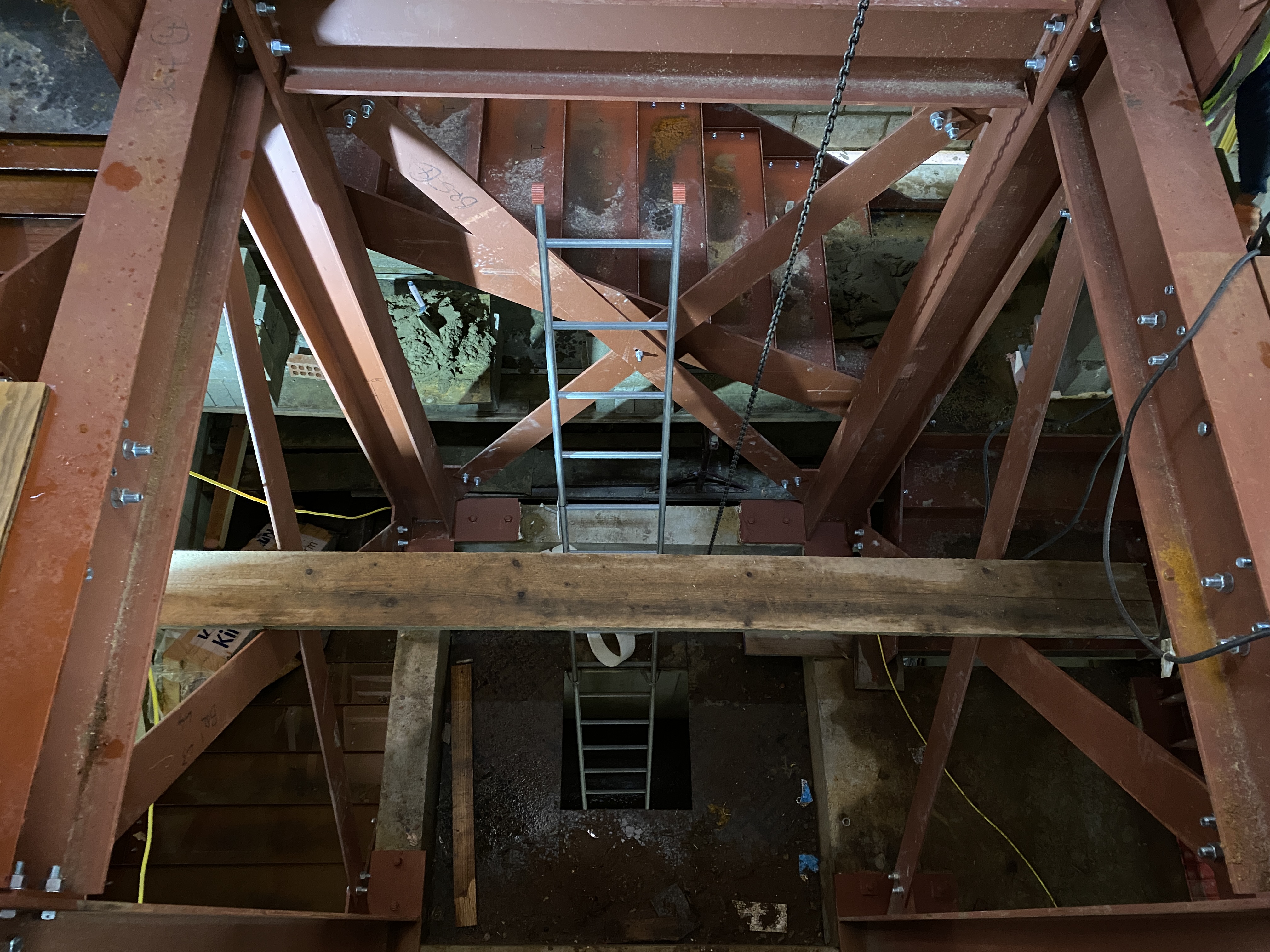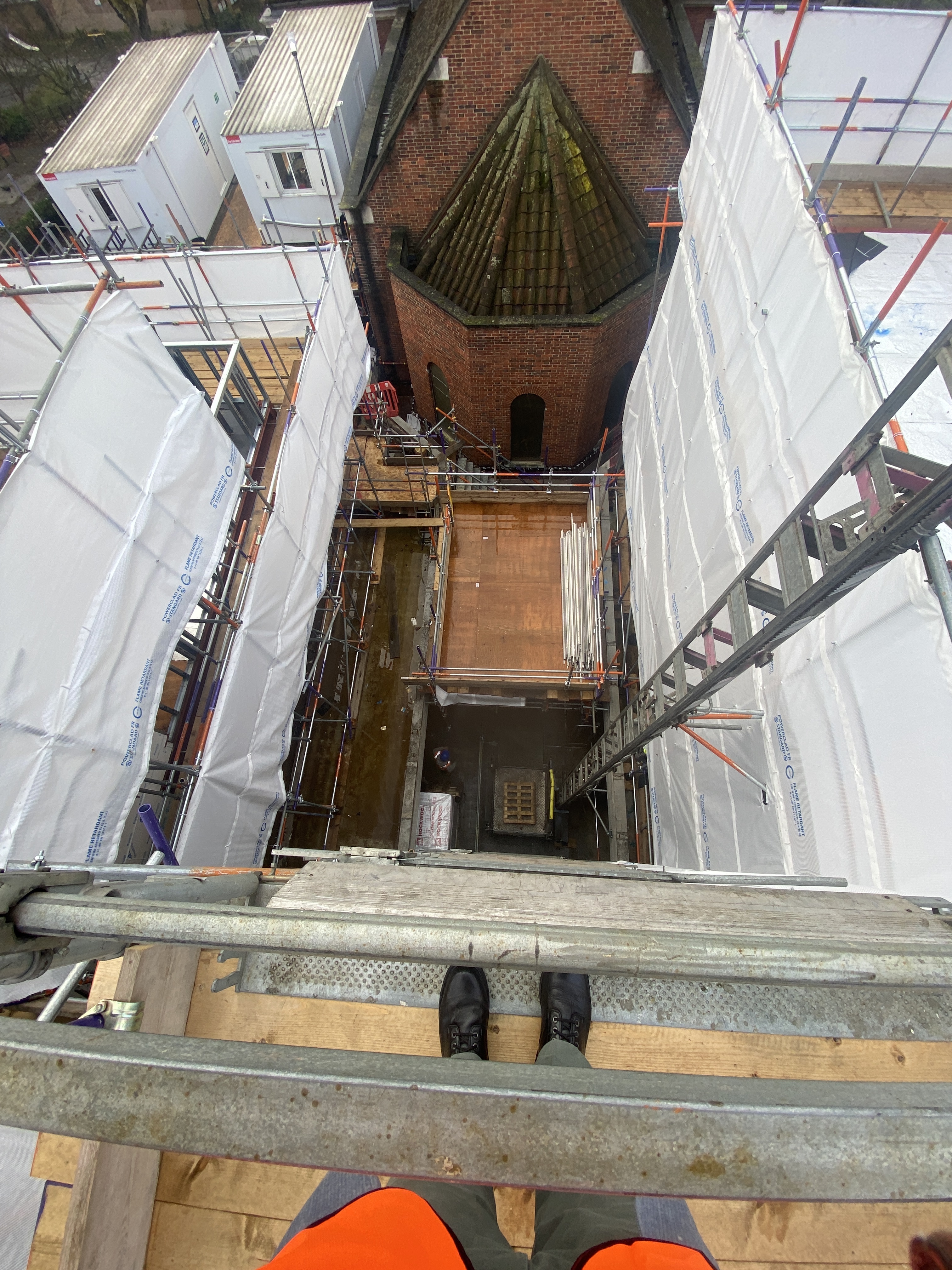 Fra slutten av november 2023 ble hele bygget pakket inn i presenning. Fra nå er all bygging skjult utenfra. Her kommer bilder tatt fra innsiden: