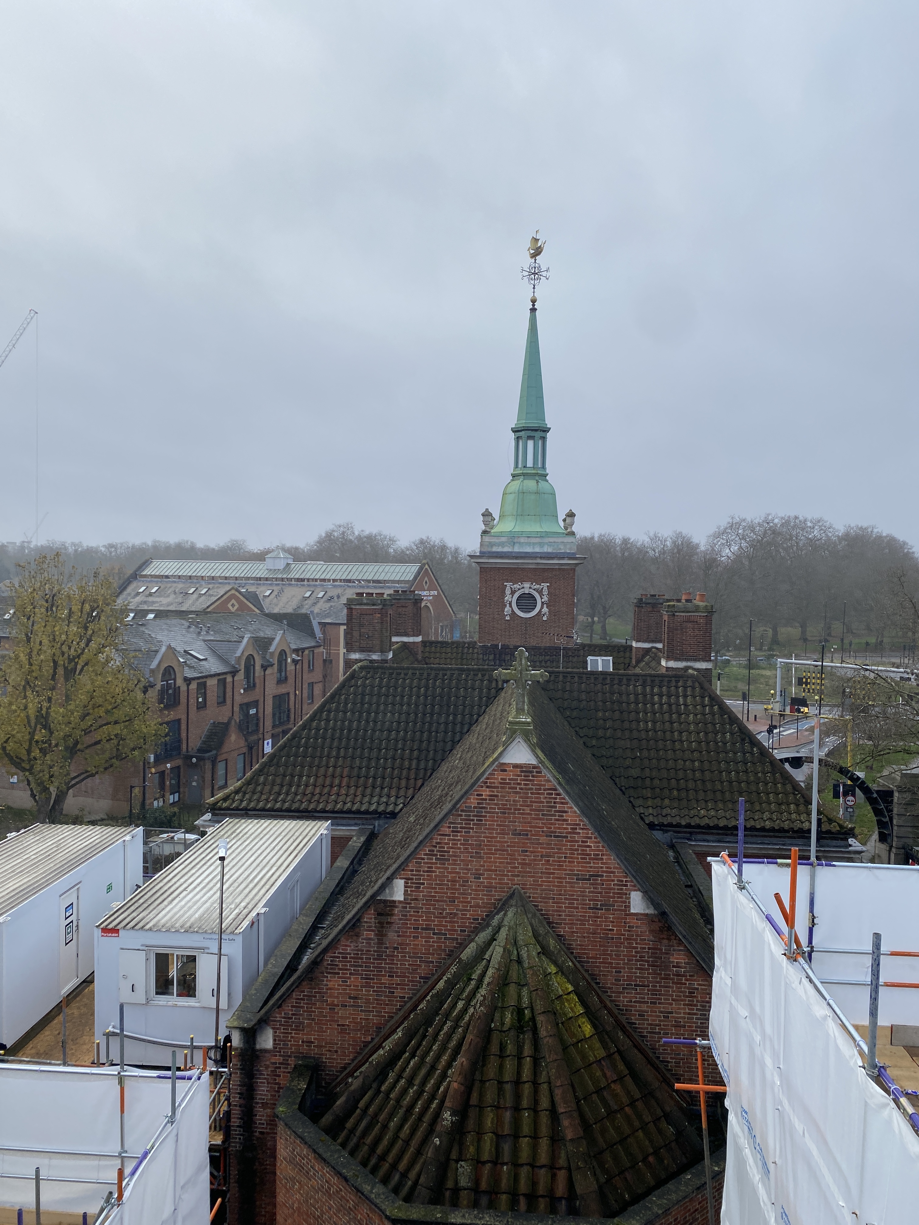 Fra andre etasje langs Brunel Road i leilighetsdelen, sett mot kirken.