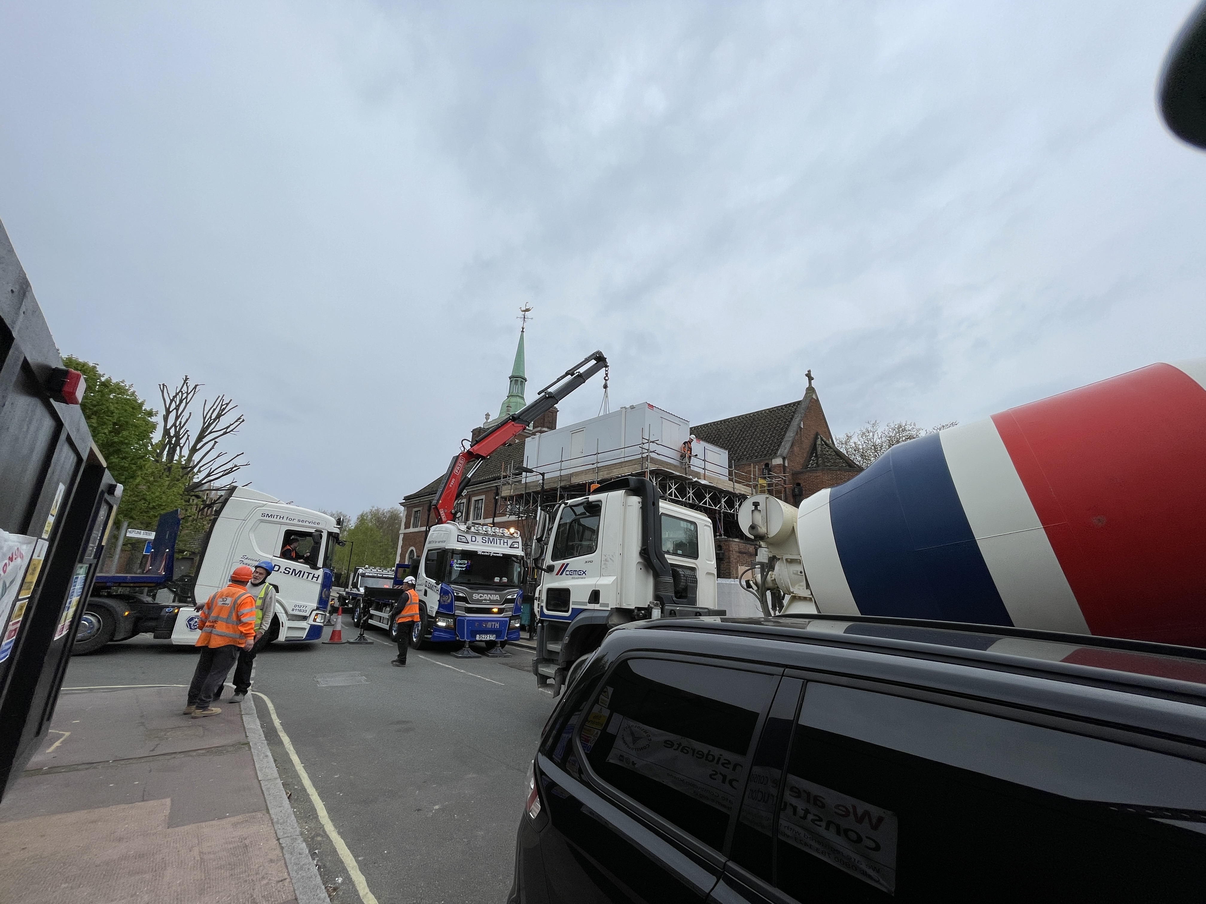 Med ett ble det full kork utenfor kirken! To store trailere med kraner måtte til for å frakte kontainerene - og samtidig kom det en sementbil.