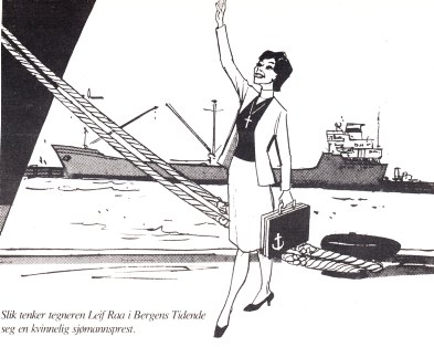 INGEN INNVENDINGER: Slik så tegner i Bergens Tidende Leif Raa for seg at en kvinnelig sjømannsprest kom til å se ut. Sjømannskirken gjorde det året et prinsippvedtak om at organisasjonen ikke hadde noeninnvendinger – verken prinsipielle eller teologiske – til ansettelse av kvinnelige sjømannsprester. Illustrasjon: Leif Raa/Trykket i Bud & Hilsen nr. 10/1983