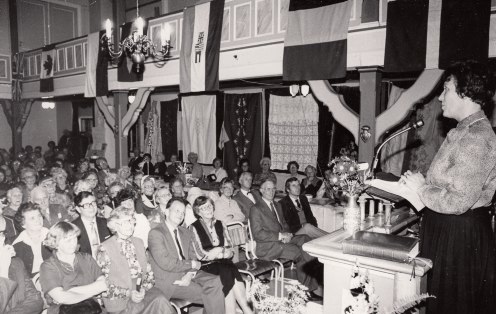 FØRSTE KVINNELIGE STYRELEDER: Første kvinnelige styreleder i Sjømannskirkens hovedstyre, Målfrid Espedal, taler til en fullsatt forsamling av organisasjonens støttespillere i Haugesund bedehus tidlig i 1980-årene.